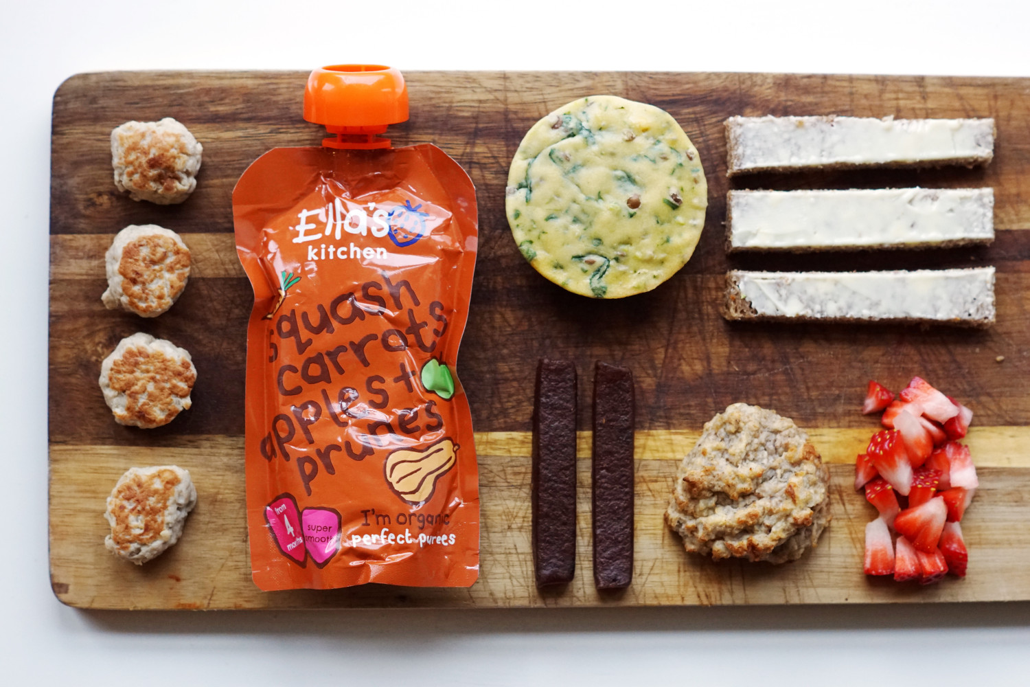 Mini frikadeller, smoothie m. squash, gulerødder og æble, linse og spinathapser (opskrift nederst i indlægget), lille frugtstang i halve, kernefrit rugbrød m. smør, grødbolle (opskrift nederst i indlægget), små stykker frisk jordbær.