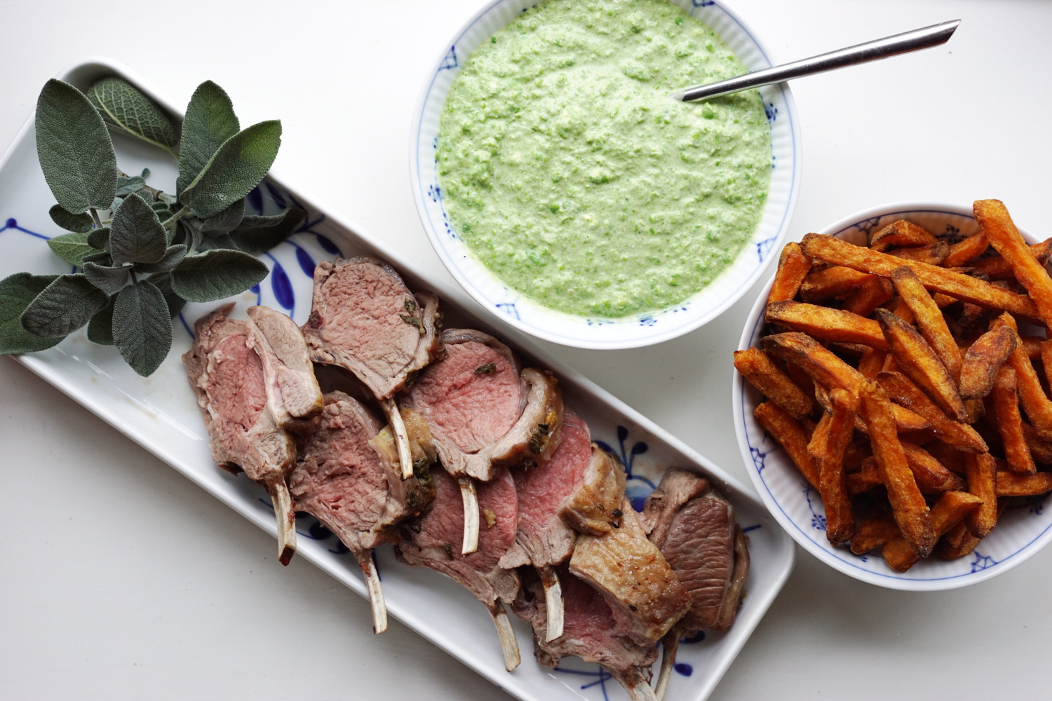 SERVERINGSFORSLAG: Server lammekronen og ærtedip sammen med sød kartoffel fritter (køb evt. nogle gode i supermarkedet), middelhavssalat og hjemmerørt persillemayo.