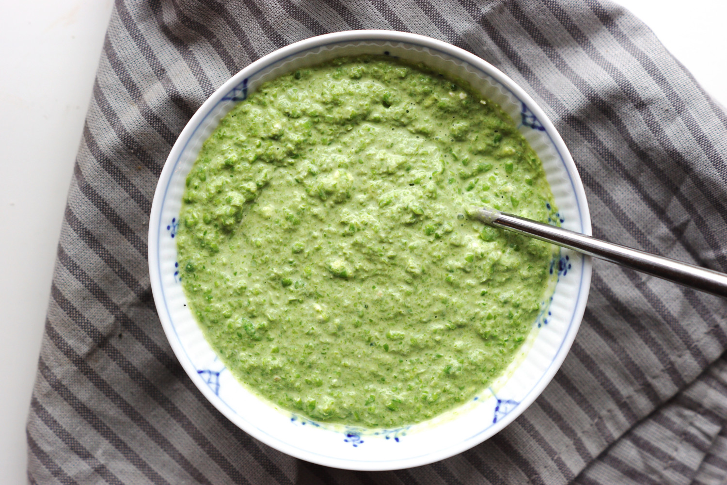 Hæld vandet fra og blend ærterne til en jævn og ensartet masse med en stavblender.