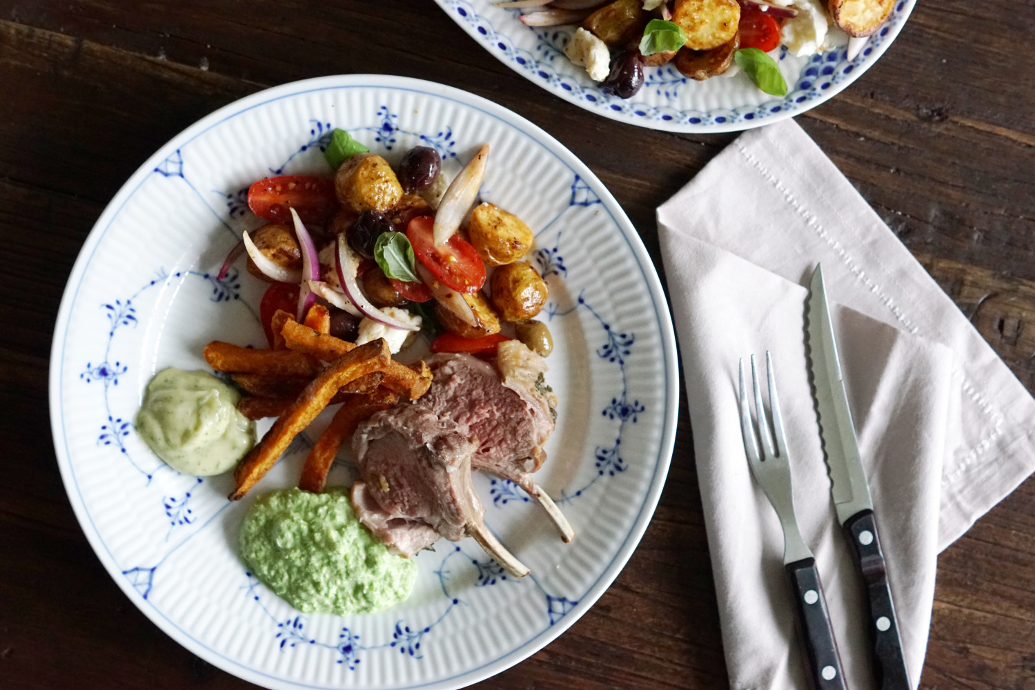 TIP! Imens lammekronen er i ovnen forberedes ærtedippen og evt. øvrigt tilbehør. Laver du den salat og persillemayo jeg foreslår nedenfor, kan du med fordel klargøre kartoflerne helt og persillemayoen dagen i forvejen så du kun skal samle salaten. Laver du sødkartoffel fritter til kan du med fordel skrue op for ovnen så snart lammekronerne tages ud og lave pomfritterne imens lammekronerne trækker de ca. 15 minutter.