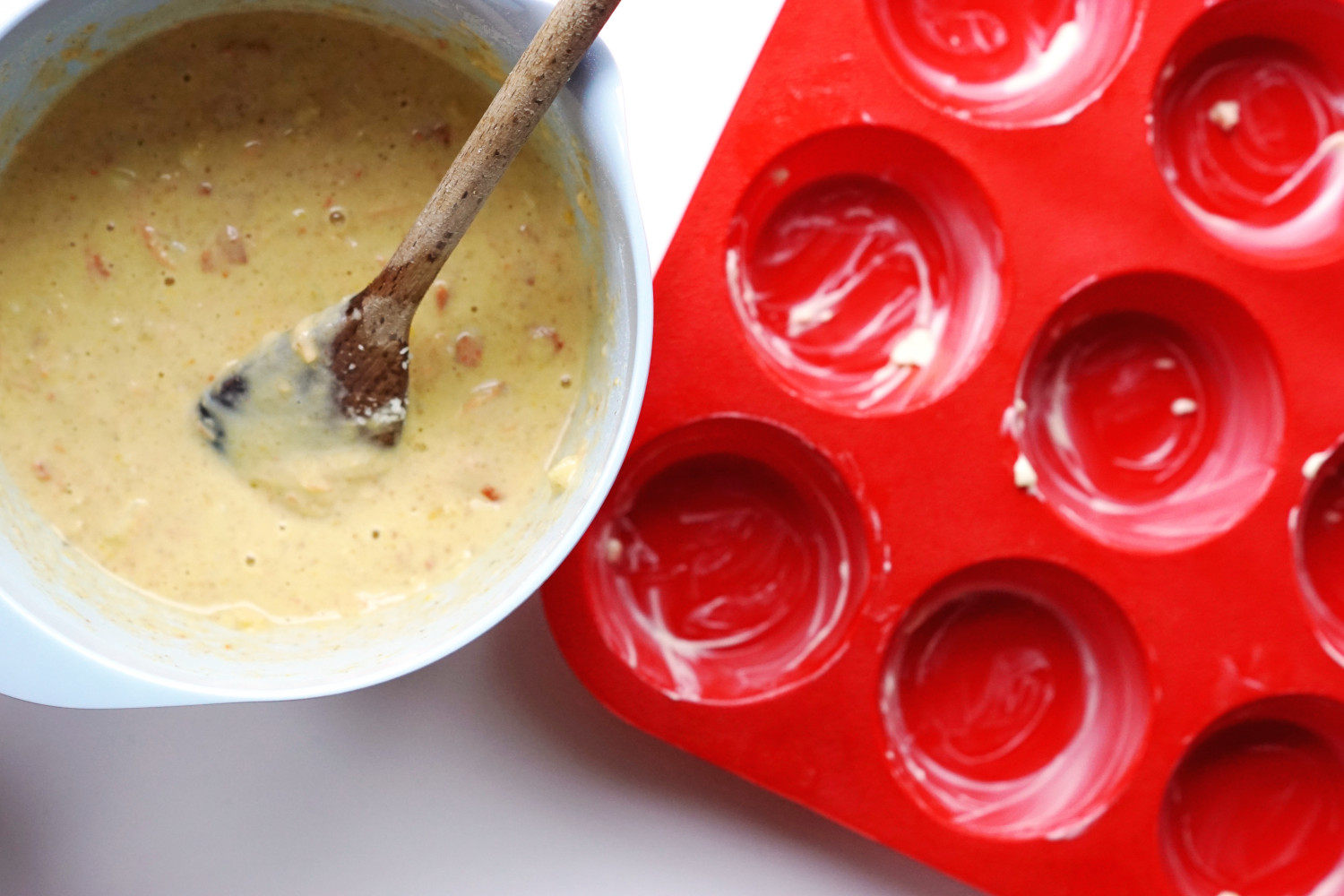 I en anden skål blandes æg, vand, revet ost, olivenolie og de revne/snittede grøntsager sammen samt kød sammen. Rør herefter melblandingen i og rør og vend i massen til den er ensartet i konsistens.