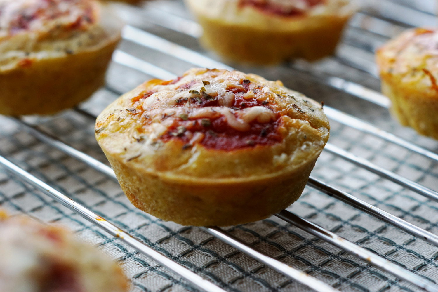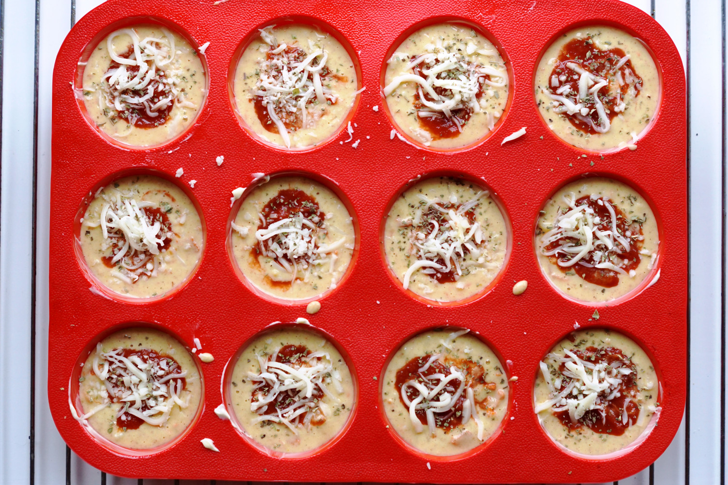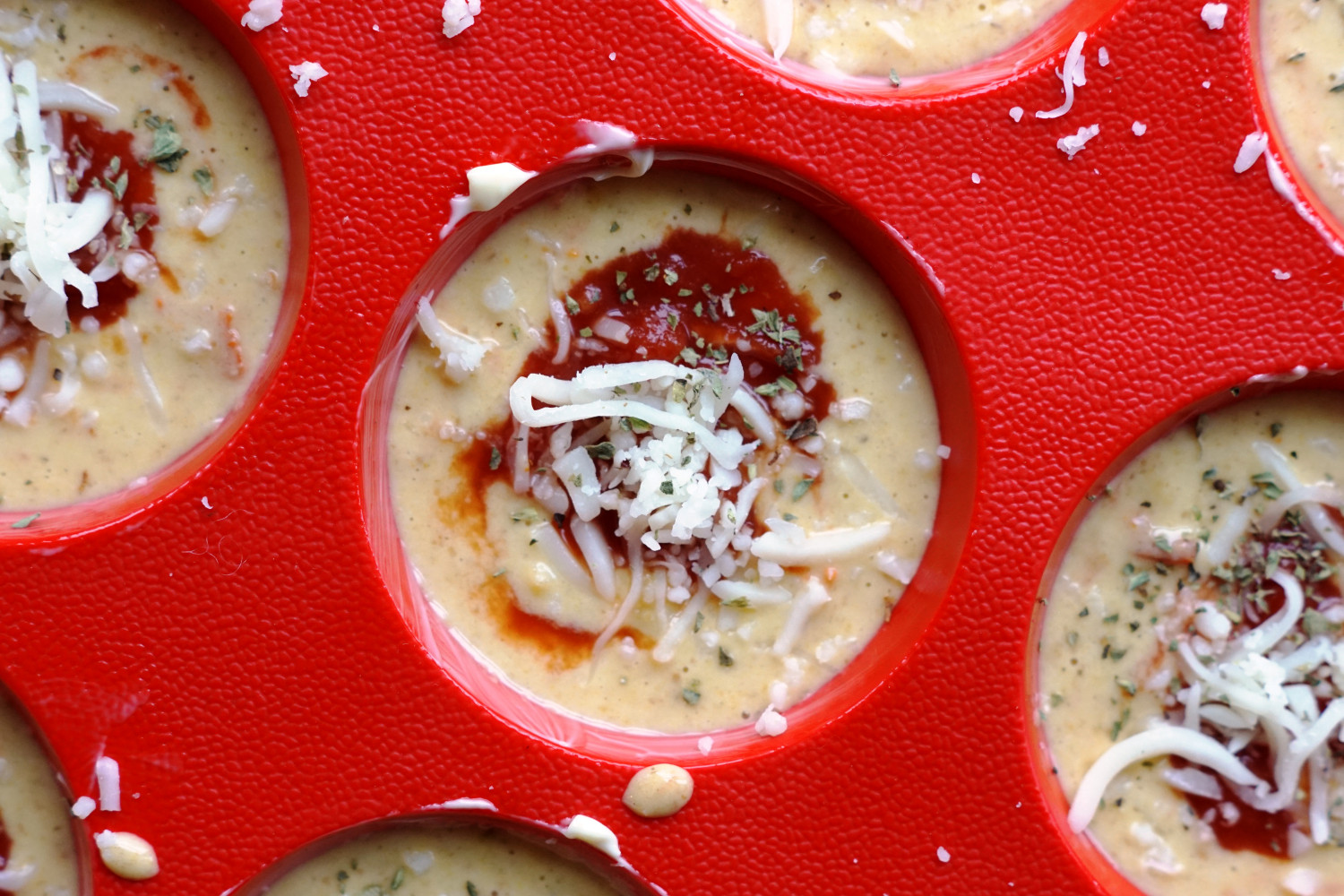 Fordel i smurte muffinforme, kom en tsk tomatsauce i hver (tryk den lidt ned i) og drys med revet ost og tørret oregano.
