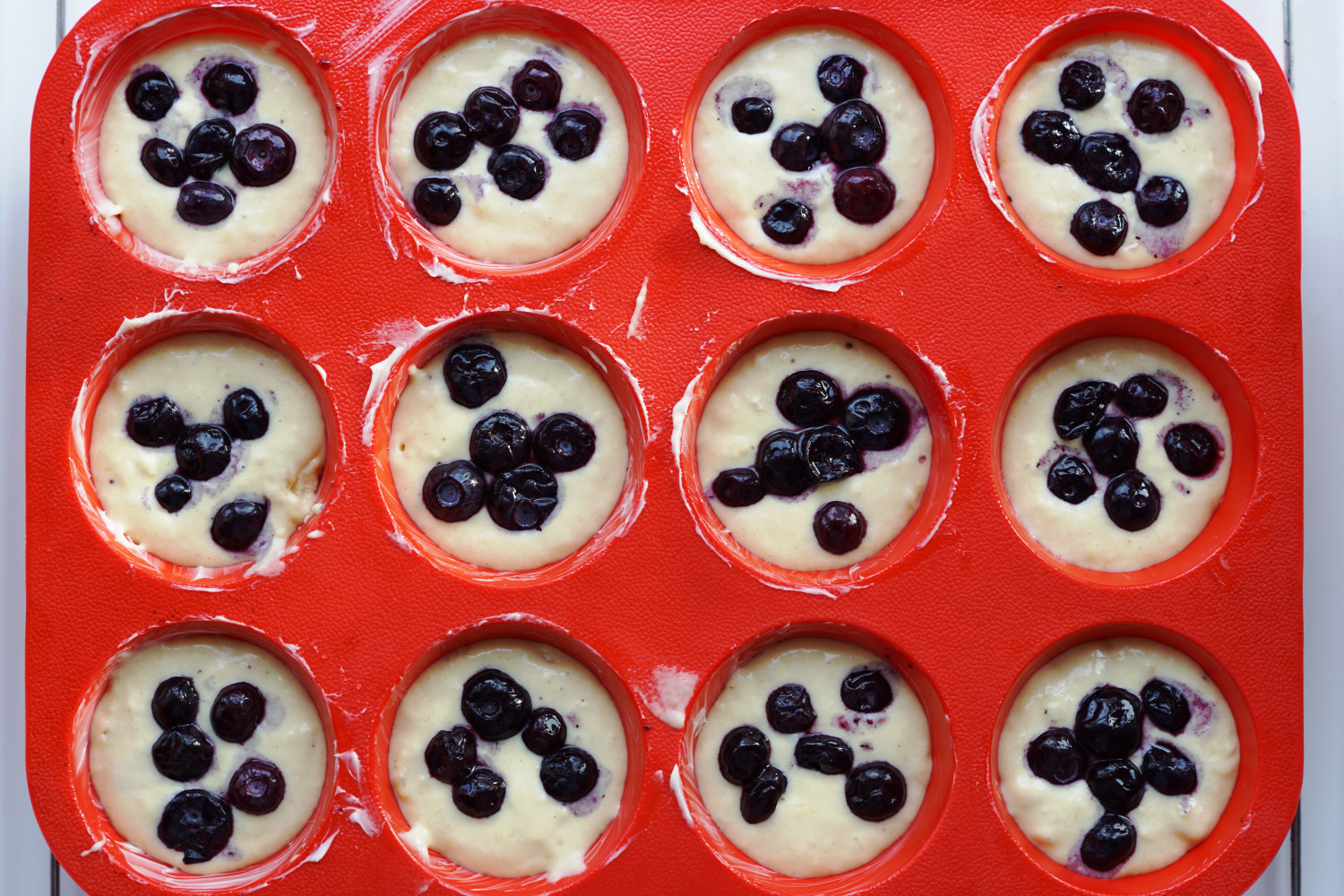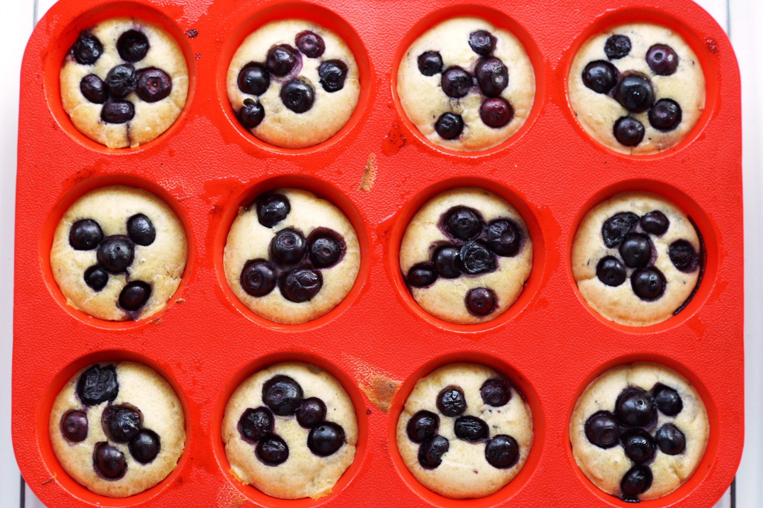 Rør grundigt sammen og fordel i 12 smurte muffinforme (gerne en type i silikone – f.eks. en muffinplade som vist på billedet ovenfor).