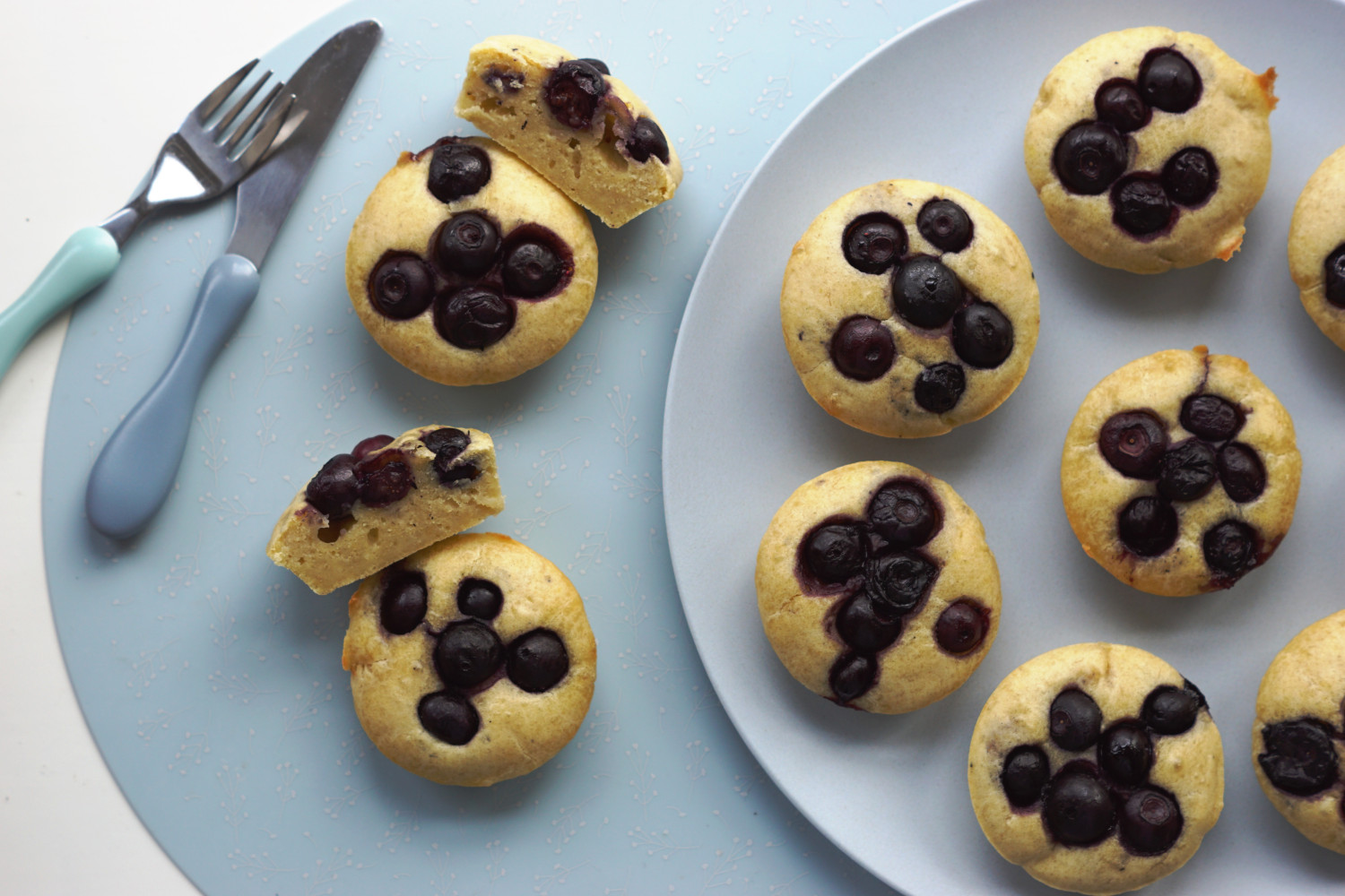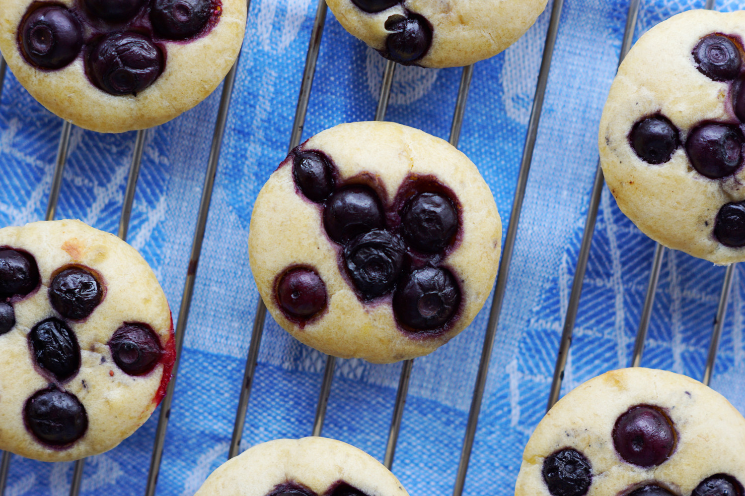 Kom 5-6 blåbær ovenpå hver og tryk dem en smule ned i dejen.