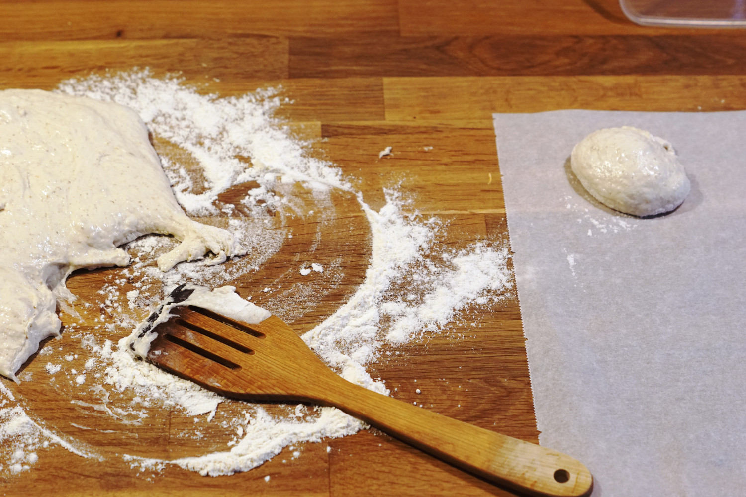 Tip den herefter ud på et meldrysset bord og brug en træpalet til forsigtigt at skubbe dejen ud af skålen med.