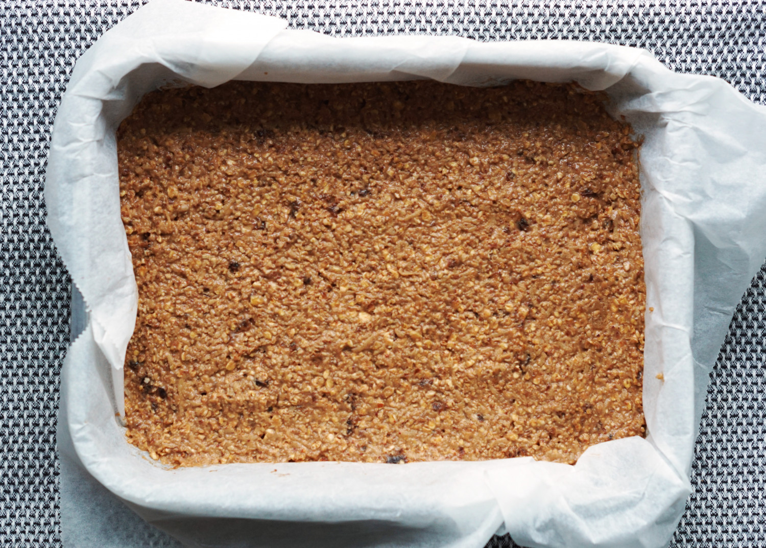 Rør grundigt sammen og fordel i en bradepande (stål eller teflon eller lign. tyndt materiale) beklædt med bagepapir. Jeg har brugt en form på 18 x 25 cm. Fordel dejen med en ske, så den er lige i overfladen over det hele.