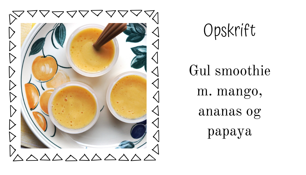 - Babyvenlige armeriddere m. smør og smoothie m. blanding af mango, ananas, papaya og banan