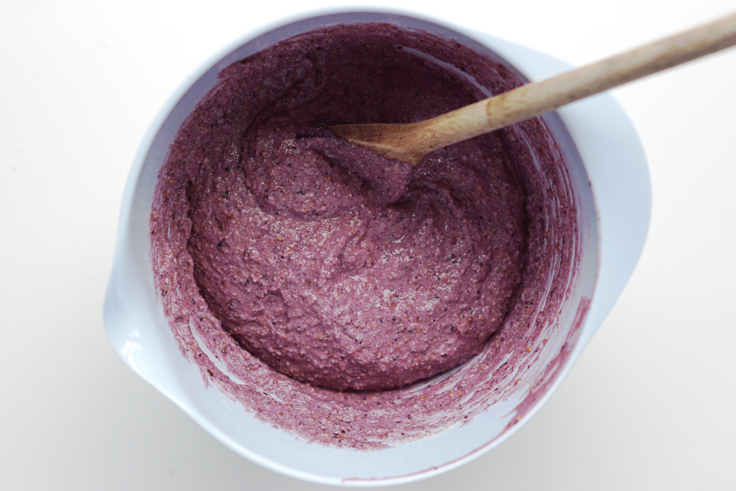 I den tomme blender kommer du nu blåbær, æg, figner og olie og blender det til det har en jævn konsistens uden store klumper. Hæld over i skålen med hirsemelet.