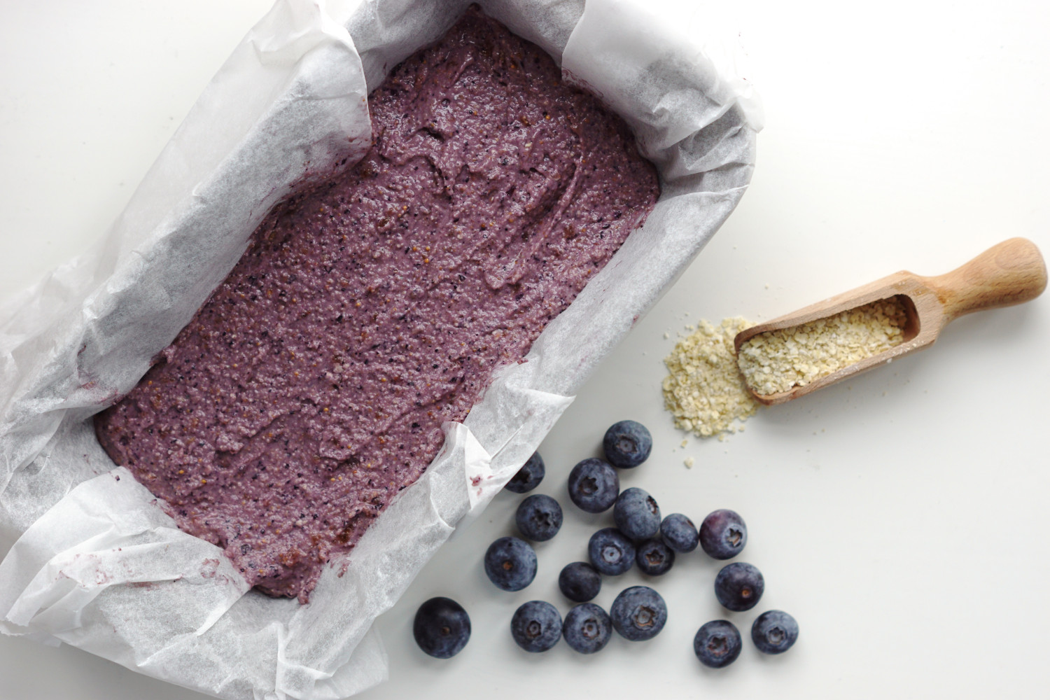 Rør indholdet i skålen sammen og fordel i en lille franskbrødsform beklædt med bagepapir.