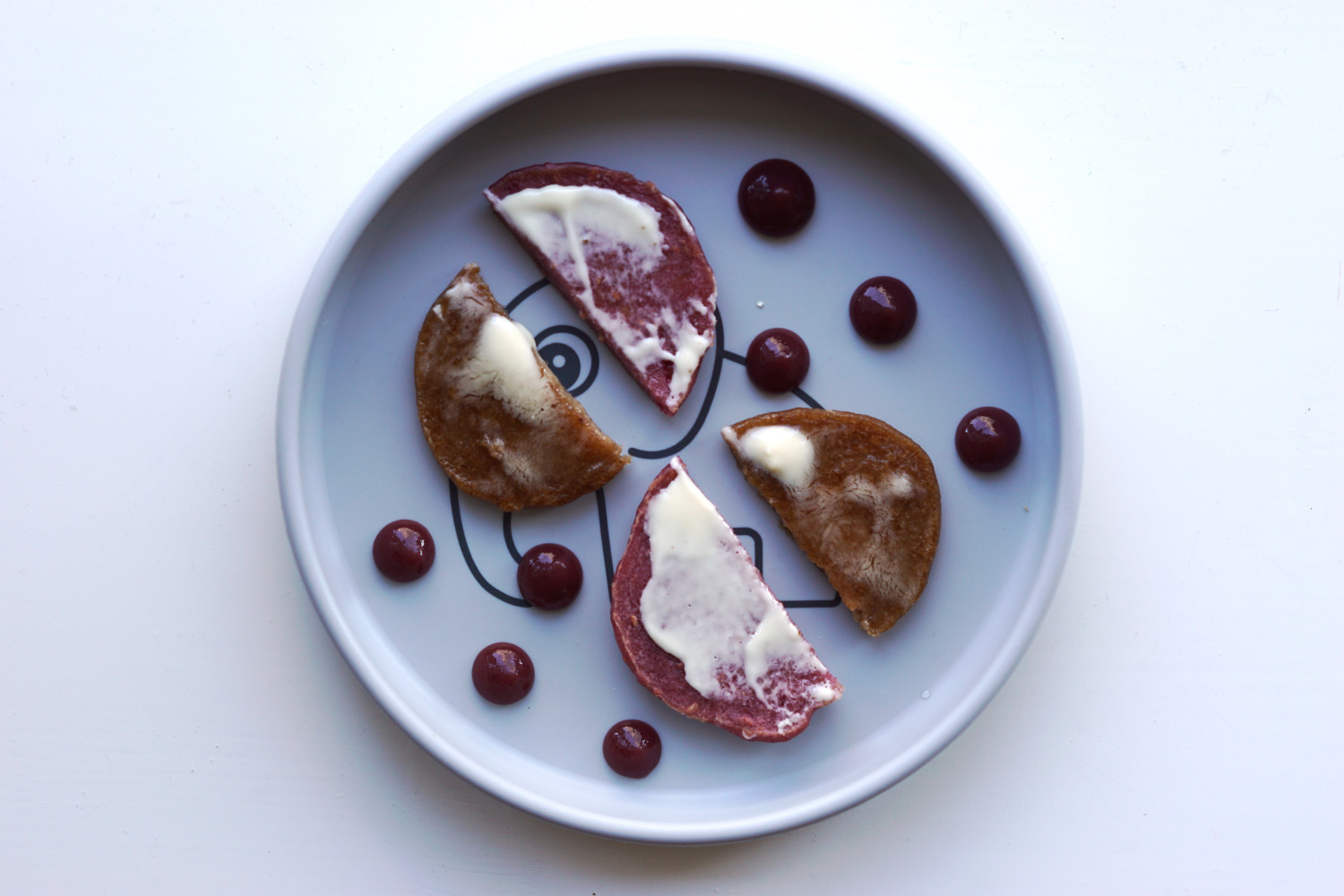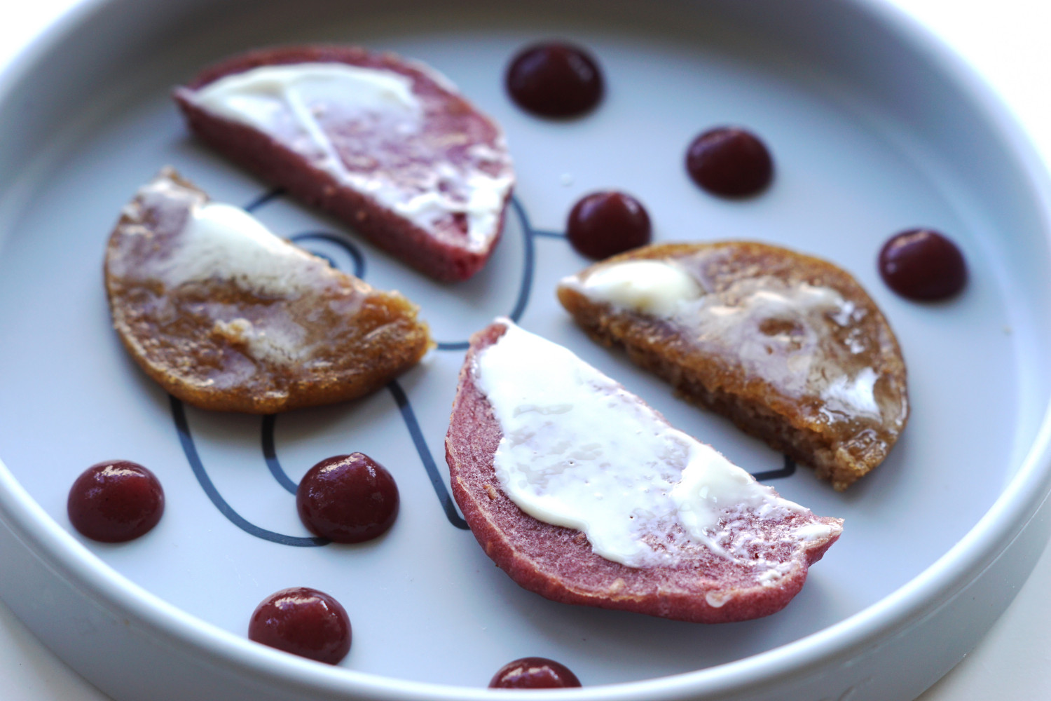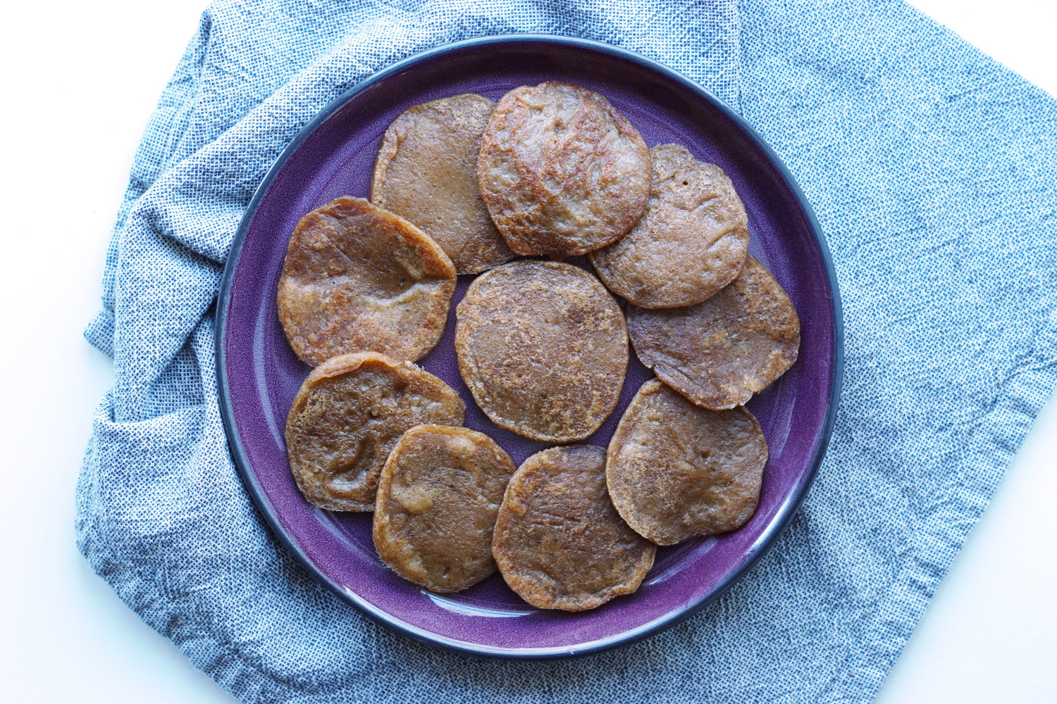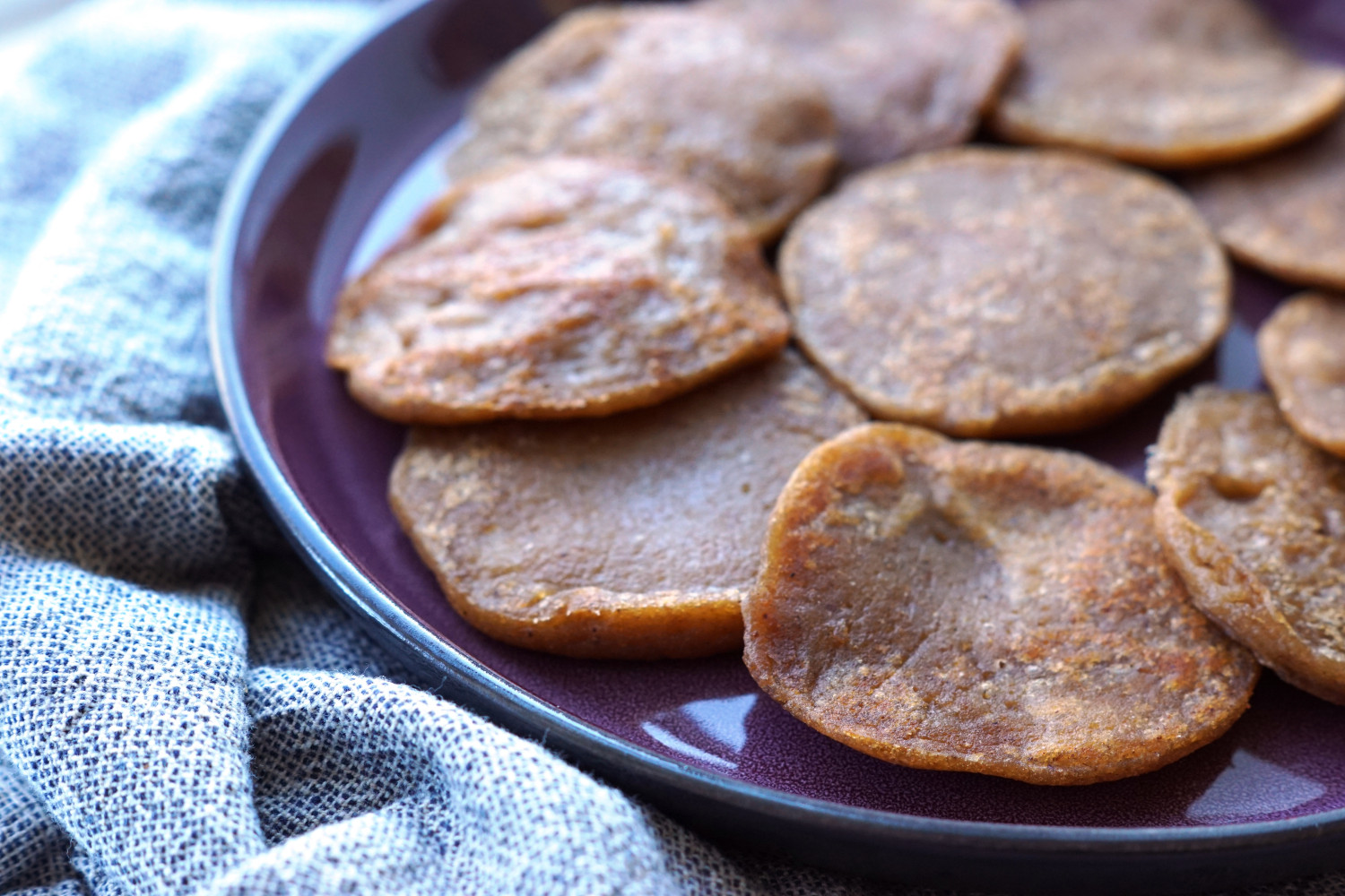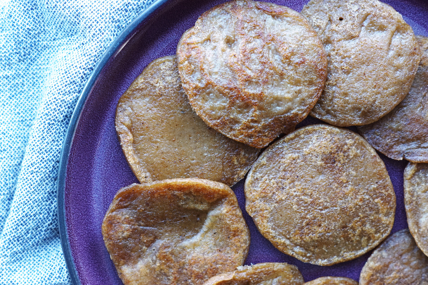 Disse små bløde pandekager er uden æg, men i stedet med kartoffelmel som bindemiddel. Har du et barn med allergi for æg, så kan du i princippet udskifte mosen i denne opskrift med alt slags frugtmos og få de skønneste æggefri pandekager med forskellige smage.