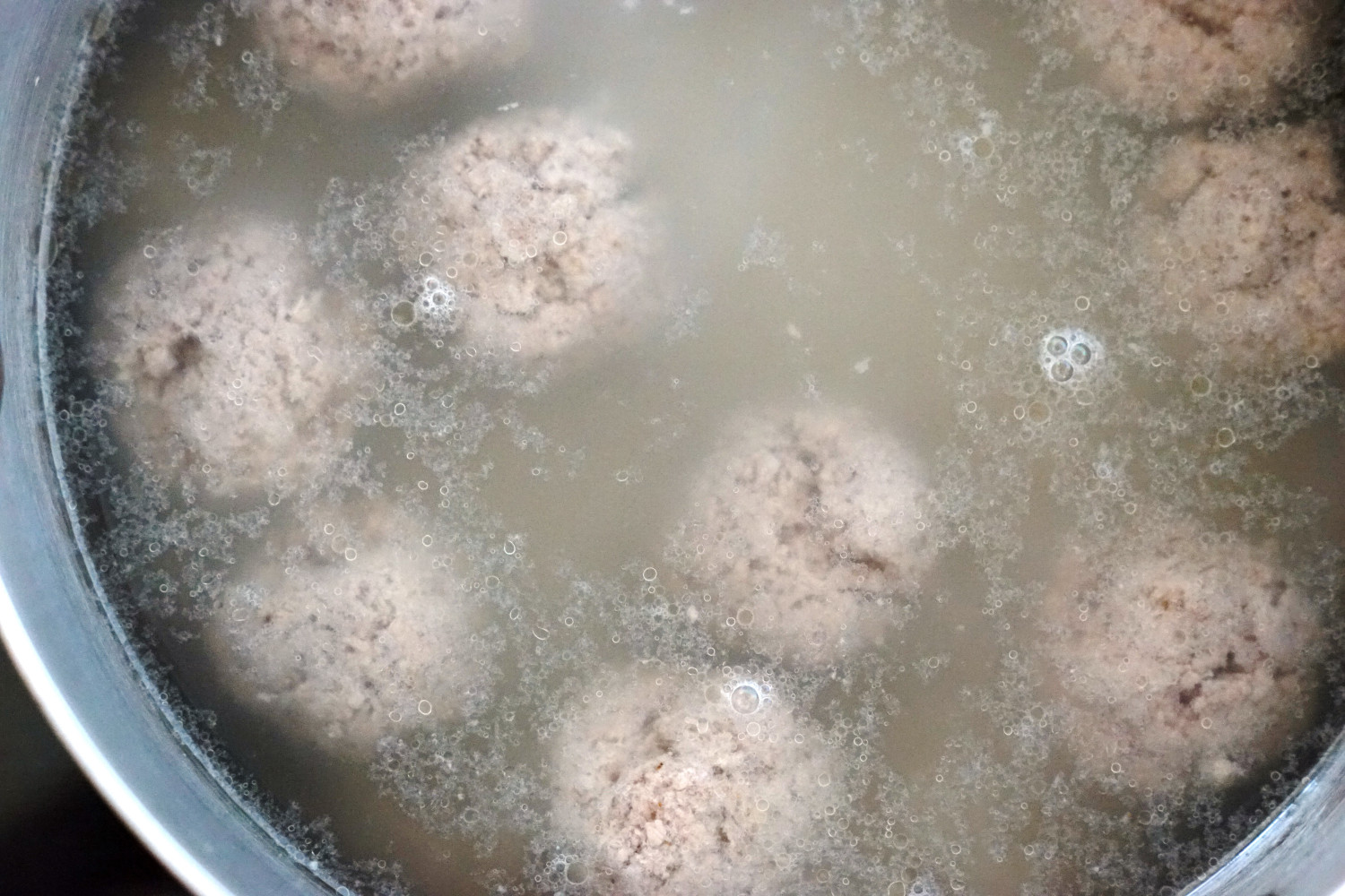Farsen formes nu med ske til ca. 10 kødboller (ca. størrelse som en bordtennisbold) som forsigtigt sænkes i det letboblende vand.