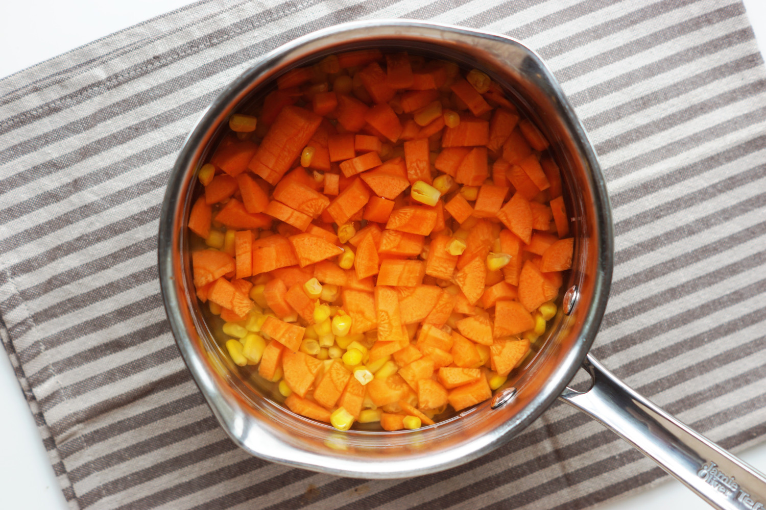 Kom majs og gulerod i en lille gryde og dæk med rigeligt vand (ca. 5 dl).