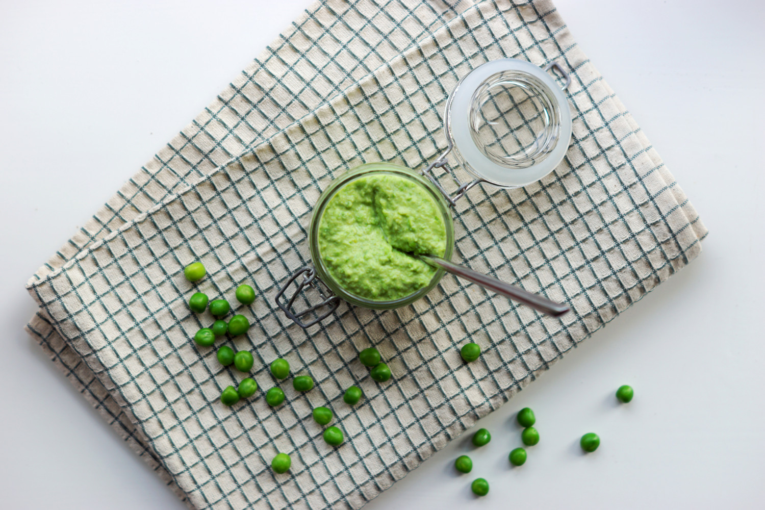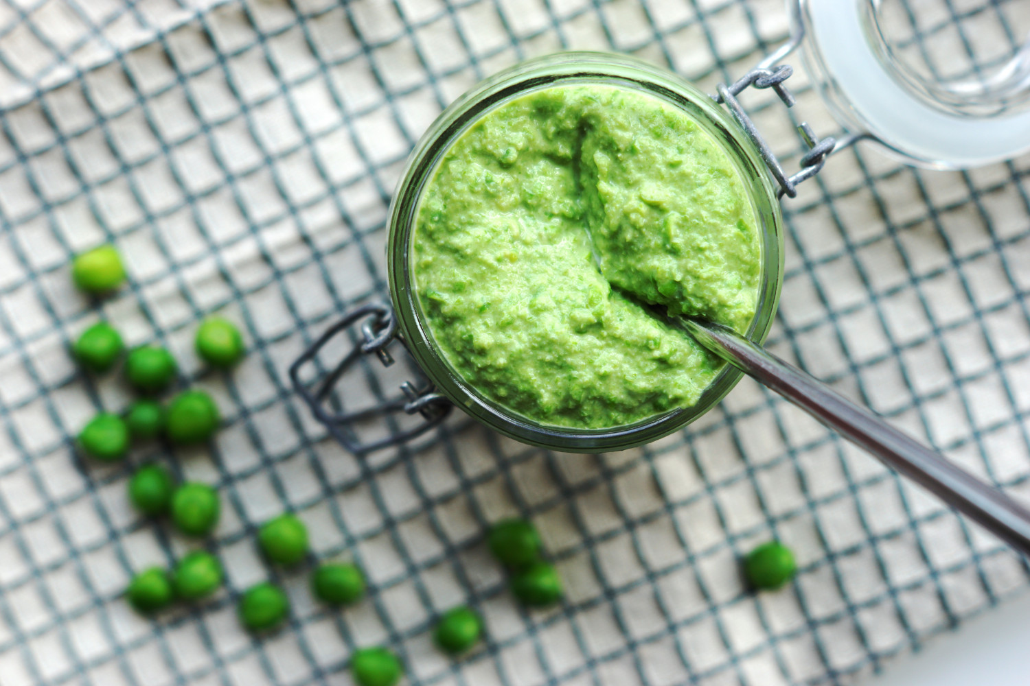 Rør en spsk mayonaise ud i ærtemassen og fyld det i et rent glas med låg.