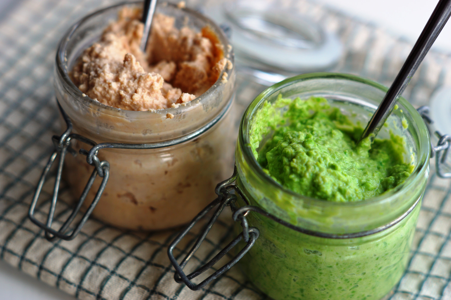 Ærtecreme (til højre) og torskerognsmousse (til venstre). To velsmagende smørepålæg man nemt selv kan lave.