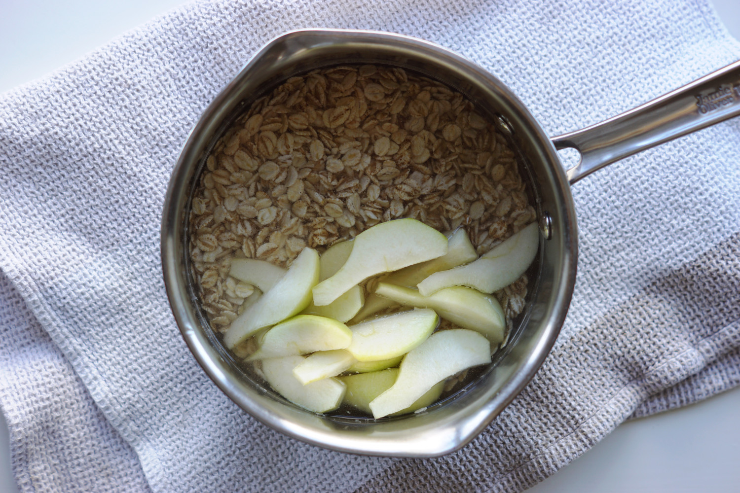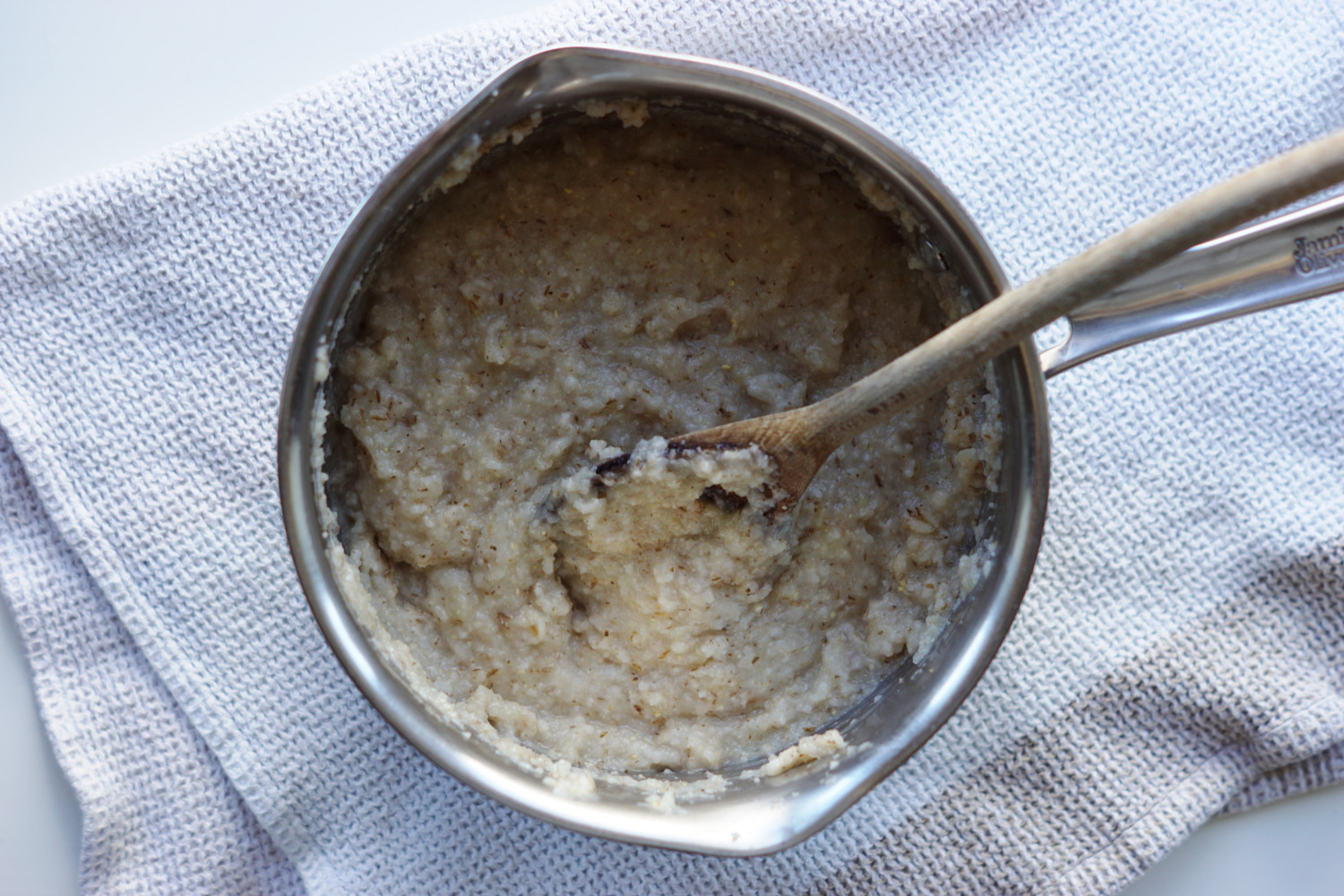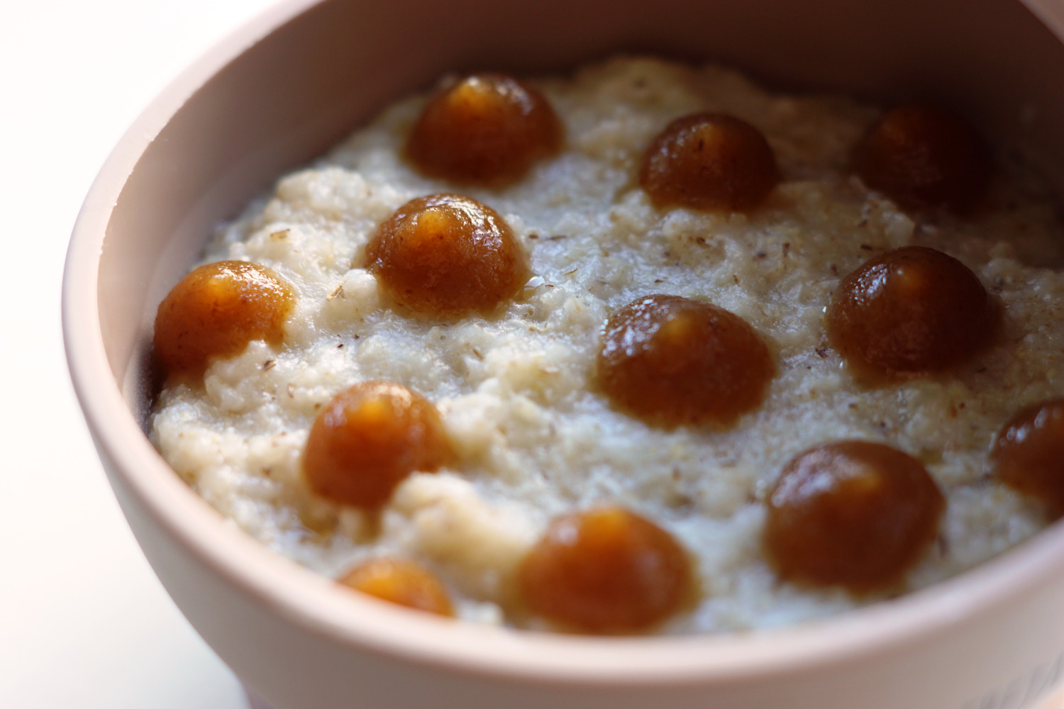 Denne opskrift er på blendet byggrød med dejlig mild sødme fra pære. Byg er en lidt glemt kornsort, men den smager skønt – en lille smule mere sødligt end havre, synes jeg.