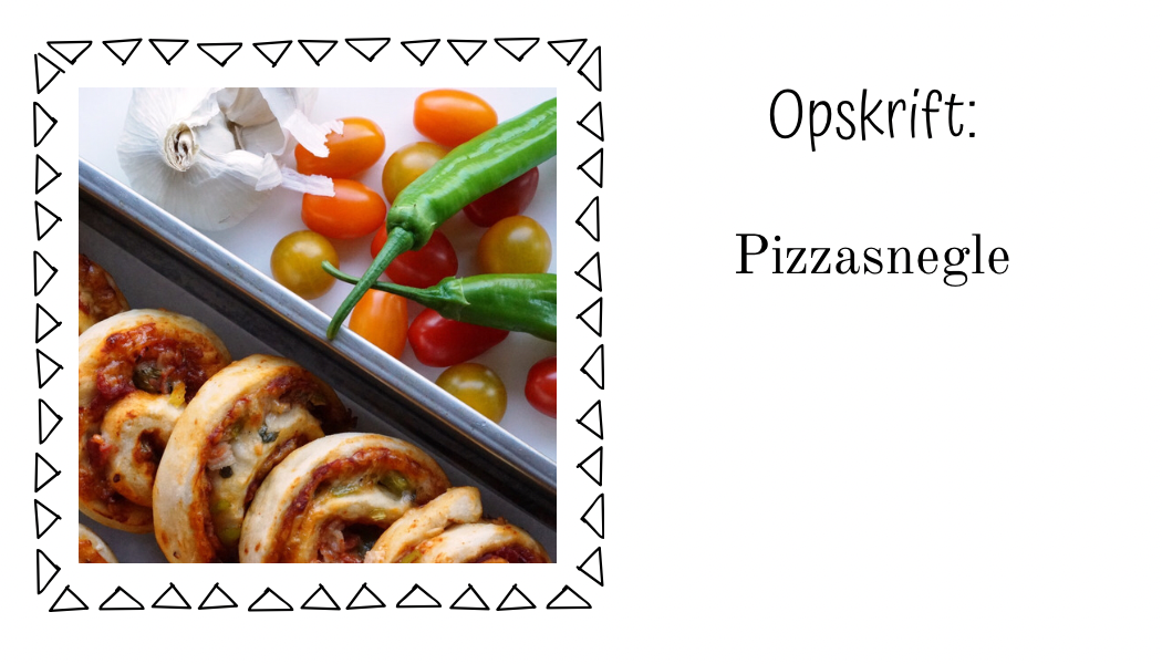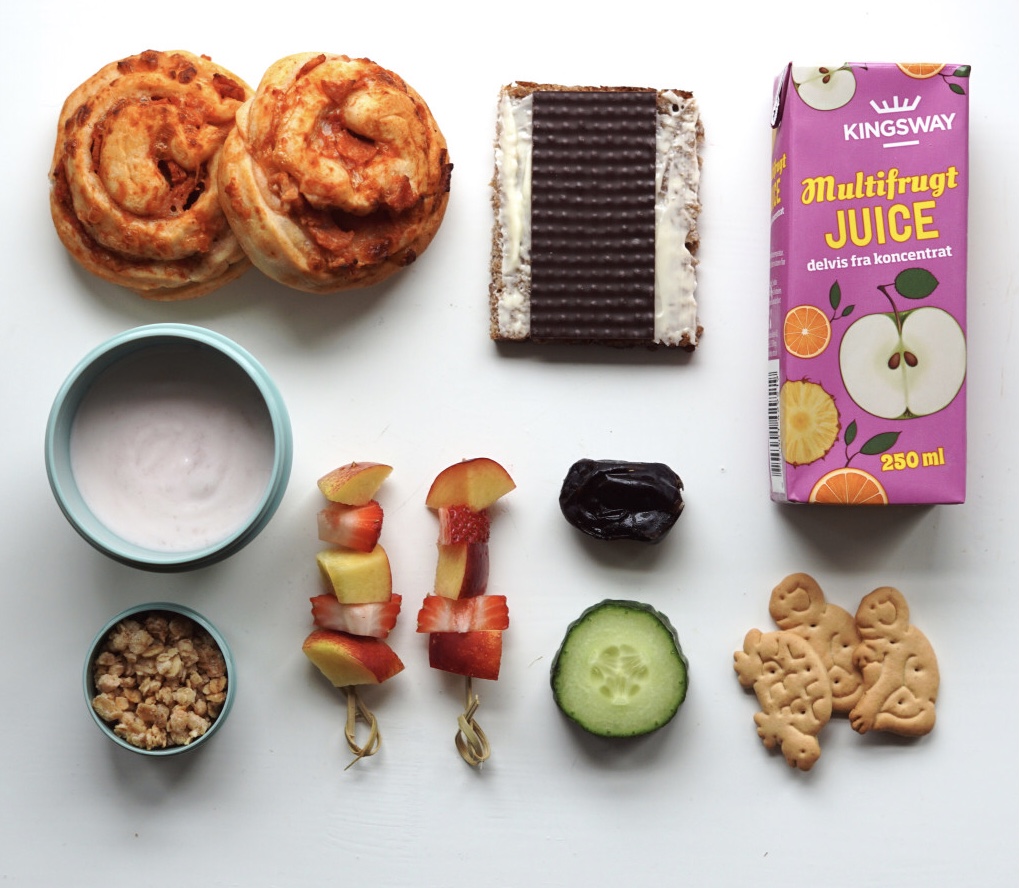 Pizzasnegle, rugbrød m. mørk pålægschokolade, multifrugt juice, yoghurt, yoghurtdrys, spyd m. jordbær/nektarin, agurk, dadel uden sten og 3 små zoo kiks