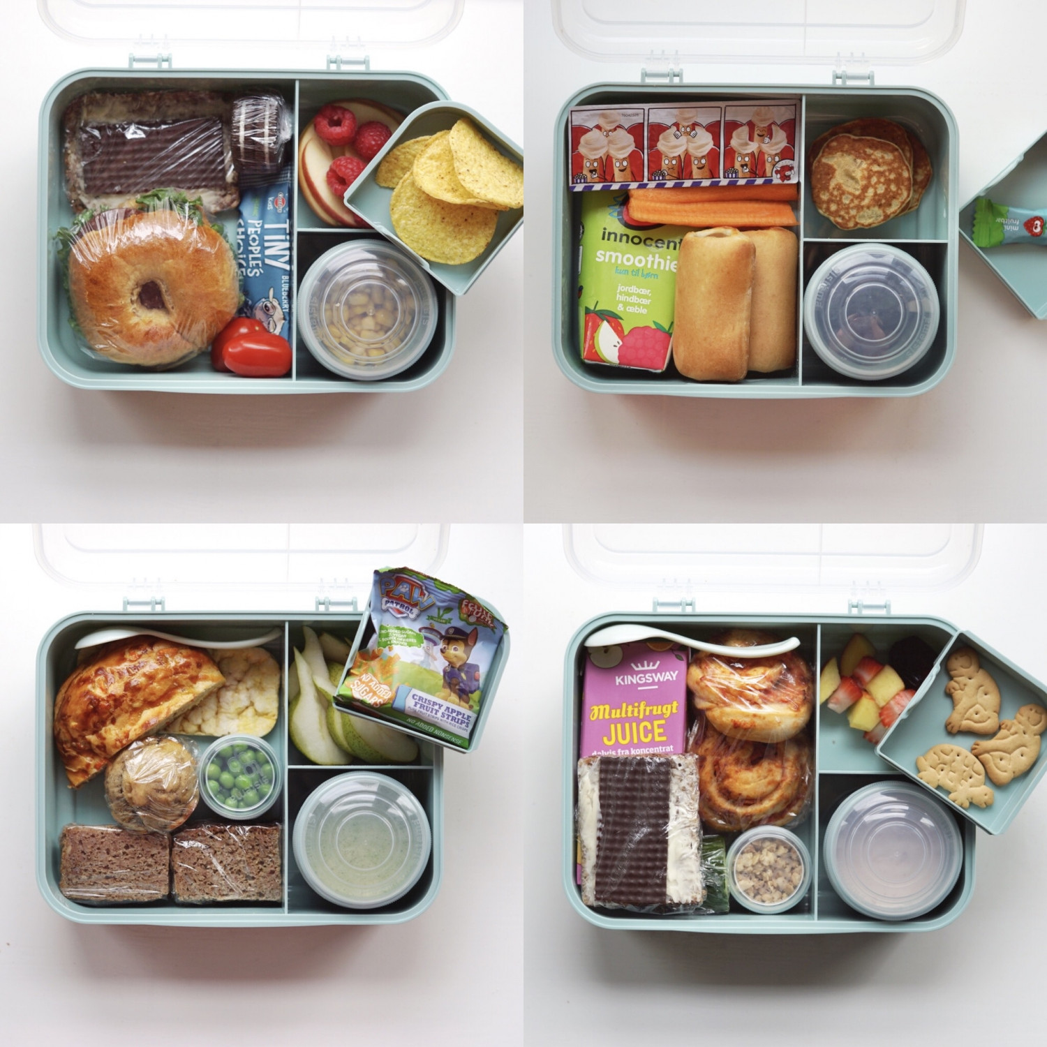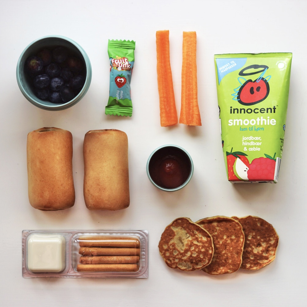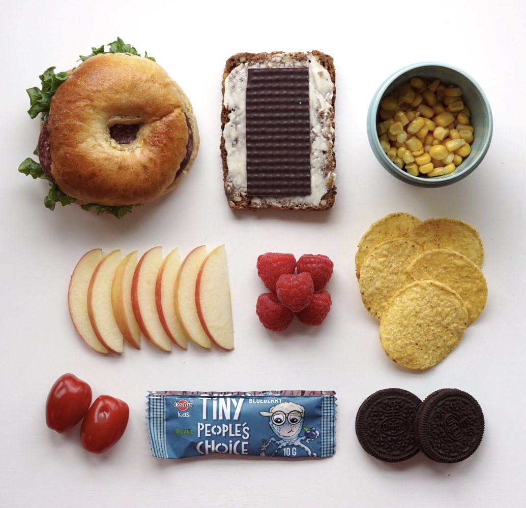 Mini bagel m. mayo/salat/spegepølse, rugbrød m. mørk pålægschokolade, majs, æblebåde, hindbær, majschips, cherrytomater, figenstang m. blåbær og oreos.