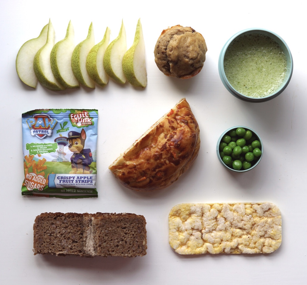 Pærebåde, bananmuffin uden raffineret sukker, smoothie m. spinat/banan/mandeldrik, Paw Patrol snack, gulerodsbrud, ærter, rugbrøds-klap-sammen m. leverpostej og majskiks