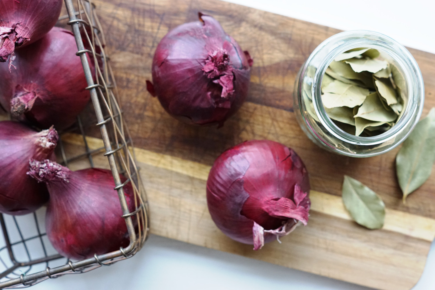 Befri løgene fra skræl og skær løgene i tynde ringe. Kom løgene i en ren beholder der kan rumme ca. 325-350 ml og læg 3 laurbærblade ved. Overhæld løgene med den varme lage, luk beholderen til og lad løgene trække i minimum 1 time (men gerne længere).