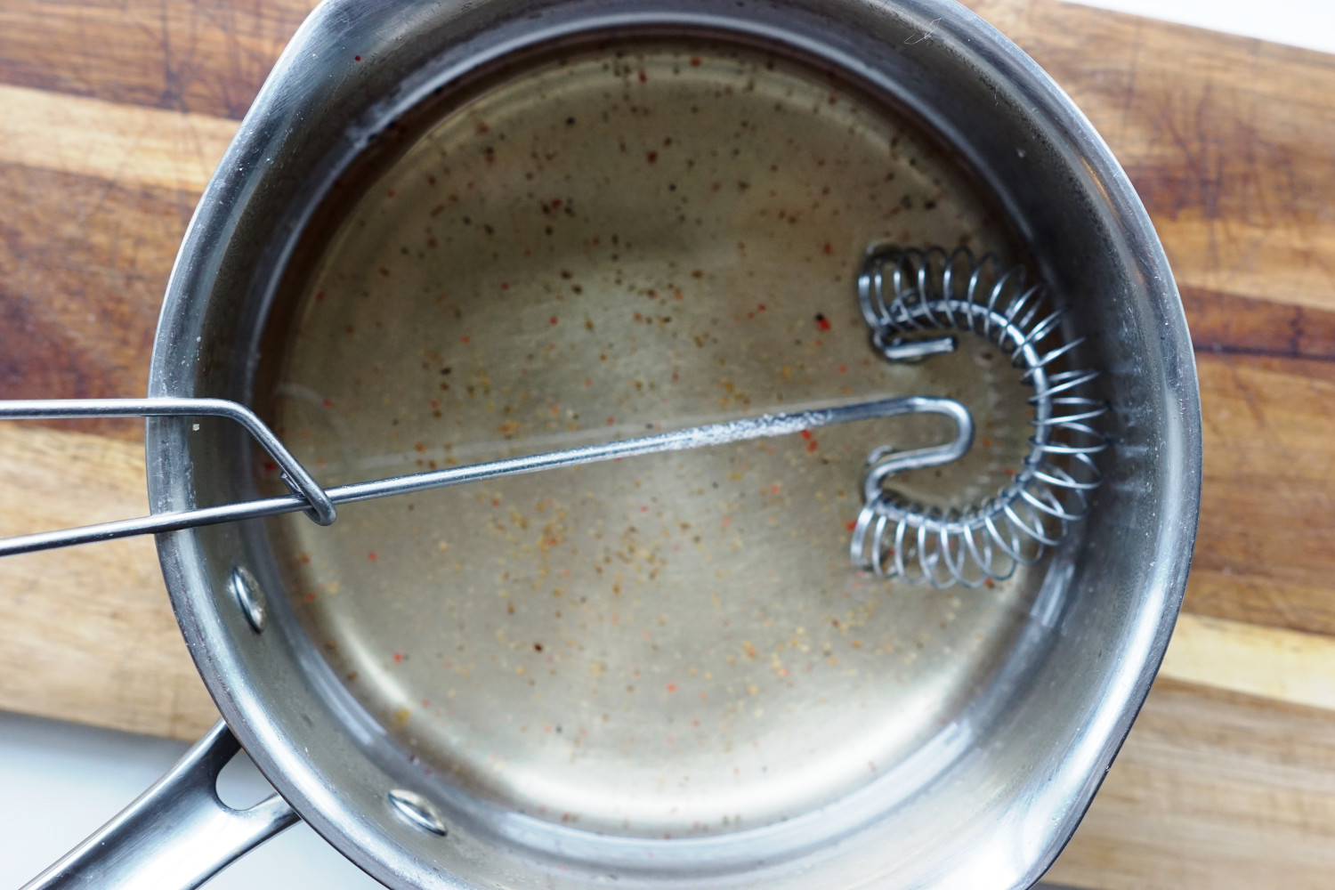 Kom eddike og sukker i en lille gryde og varm det op imens du rører i det så sukkeret opløses. Det skal lige netop nå kogepunktet. Smag eddikelagen til med salt og peber.