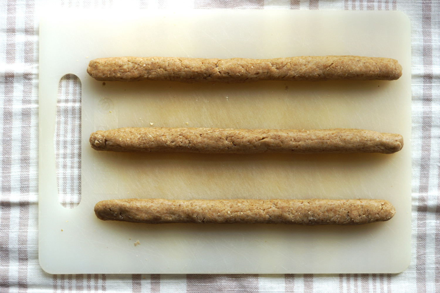 Tag dejen ud på et stort skærebræt og del den i tre lige store dele. Rul/tryk med dine hænder hver klump til en lang pølse (ca. 28 cm) med en bredde på ca. 2-2½ cm.