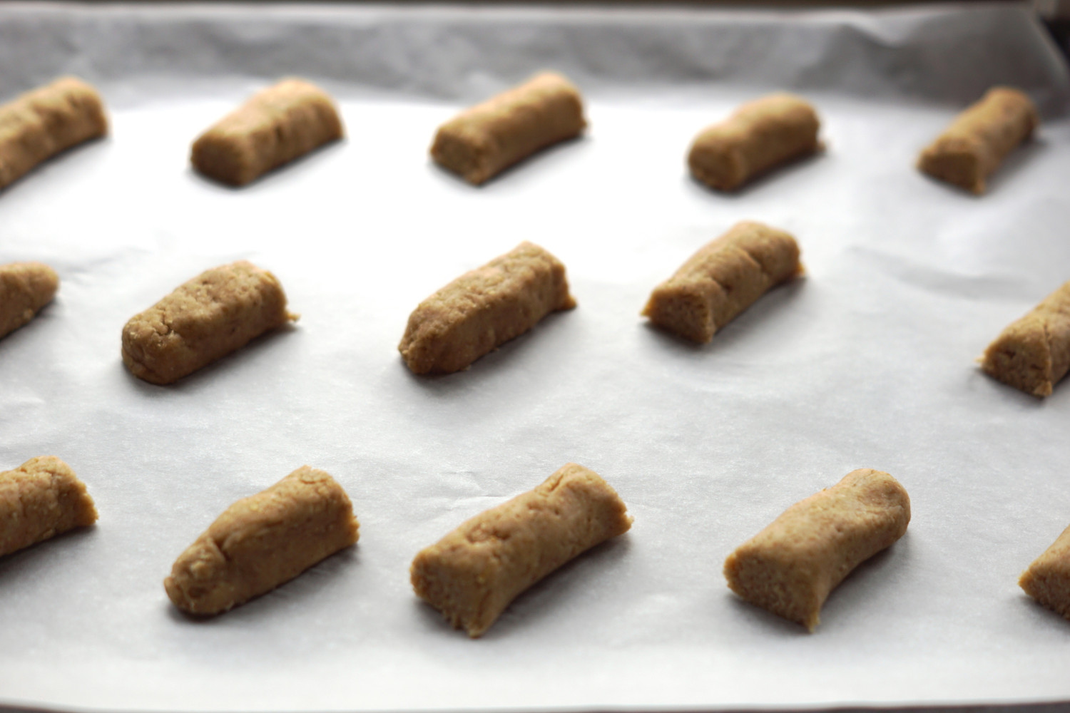 Skær hver pølse i 5 barer (så du får 15 i alt) og fordel dem på en bageplade.