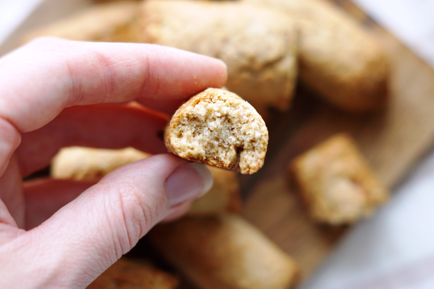 OBS! Hvis blandingen føles for tør til at samle kan du tilsætte ½-1 tsk koldt vand. Væskeindholdet kan være forskelligt i bananer, og mel kan også suge anderledes – så det kan være nødvendigt at justere konsistensen en lille smule nogle gange. Men dejen må endelig ikke blive våd og klistret. Den skal være ‘tør’.