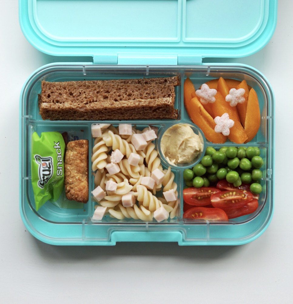 Letristede stave af kernefrit rugbrød, abrikos i tynde både, hindbærpuffs, frugtsnack i pose, kiksebar m. banan-vanilje, kogte pastaskruer, kogte kyllingetern, hummus, kogte ærter og cherrytomat i både.