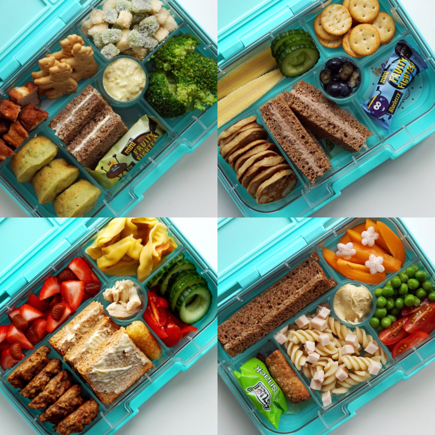 Madpakkerne her er tænkt i forlængelse af en BLW-kost, hvor barnet selv styrer spisning og griber efter maden. Alle madpakkerne indeholder gode mættende fibre, lidt kød, frugt og grønt.