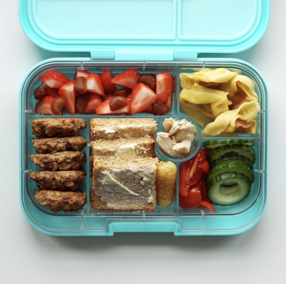 Jordbær i kvarte, frugtsnacks, fyldt pasta (m. tomat), krydrede mini grødboller, fuldkornstoast m. smør, majspuff, stegt kylling i strimler, cherrytomater i kvarte og agurkeringe.