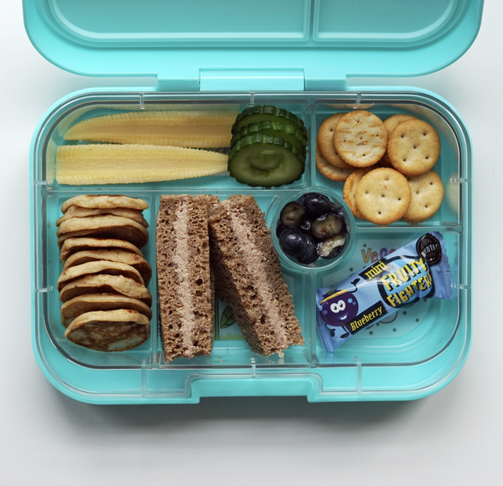 Babymajs, agurk, lyse kiks, mini banan-boghvede pandekager, kernefrit rugbrød (klapsammen i stave) m. leverpostej, blåbær i halve og mini figenstang.