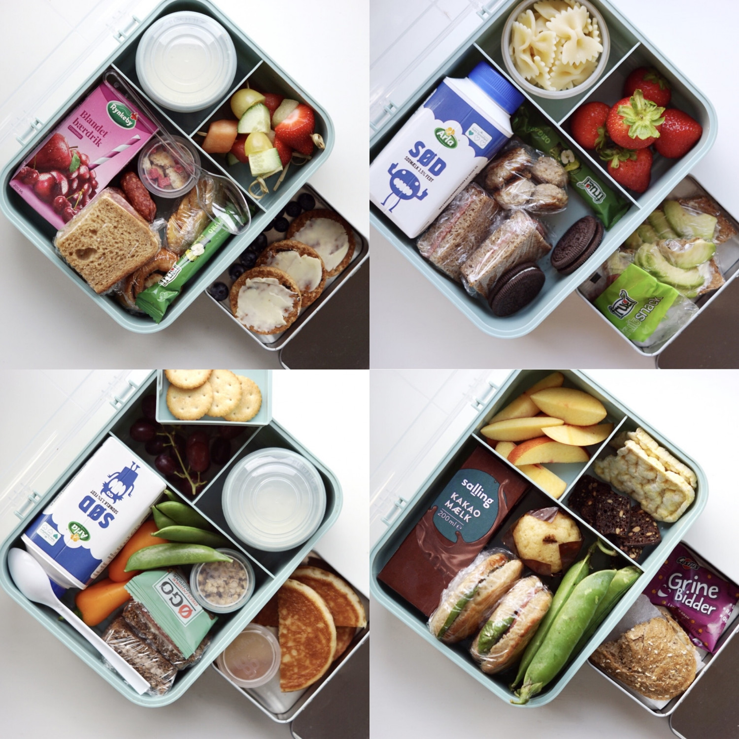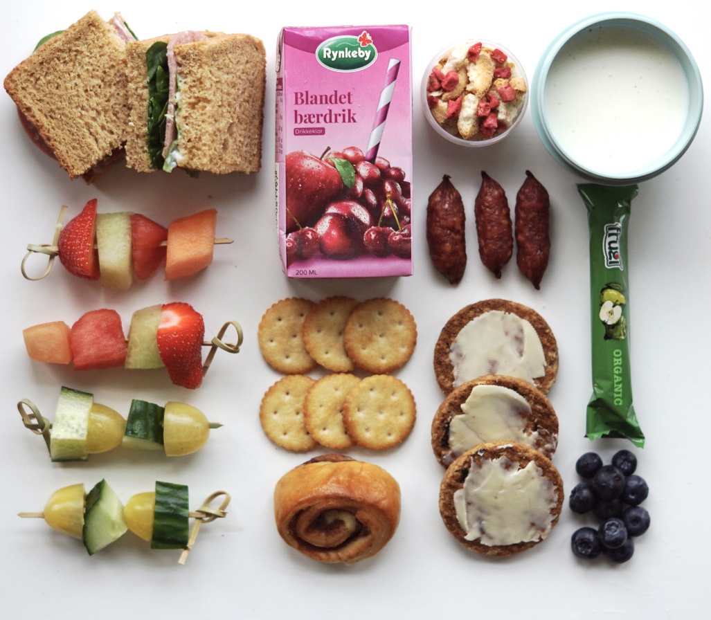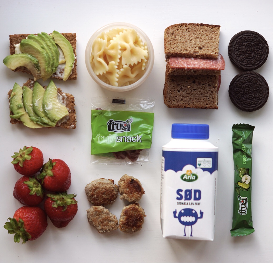 Kerneknækbrød m. smør og avocado, pasta, rugbrødsklapsammen m. spegepølse, oreos, jordbær, frugtsnack, mini frikadeller, sødmælk og figenstang.