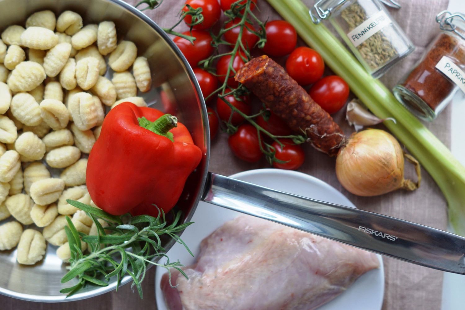Opskrift på ‘one pan’ gnoochi m. kylling og chorizo (4 pers.)