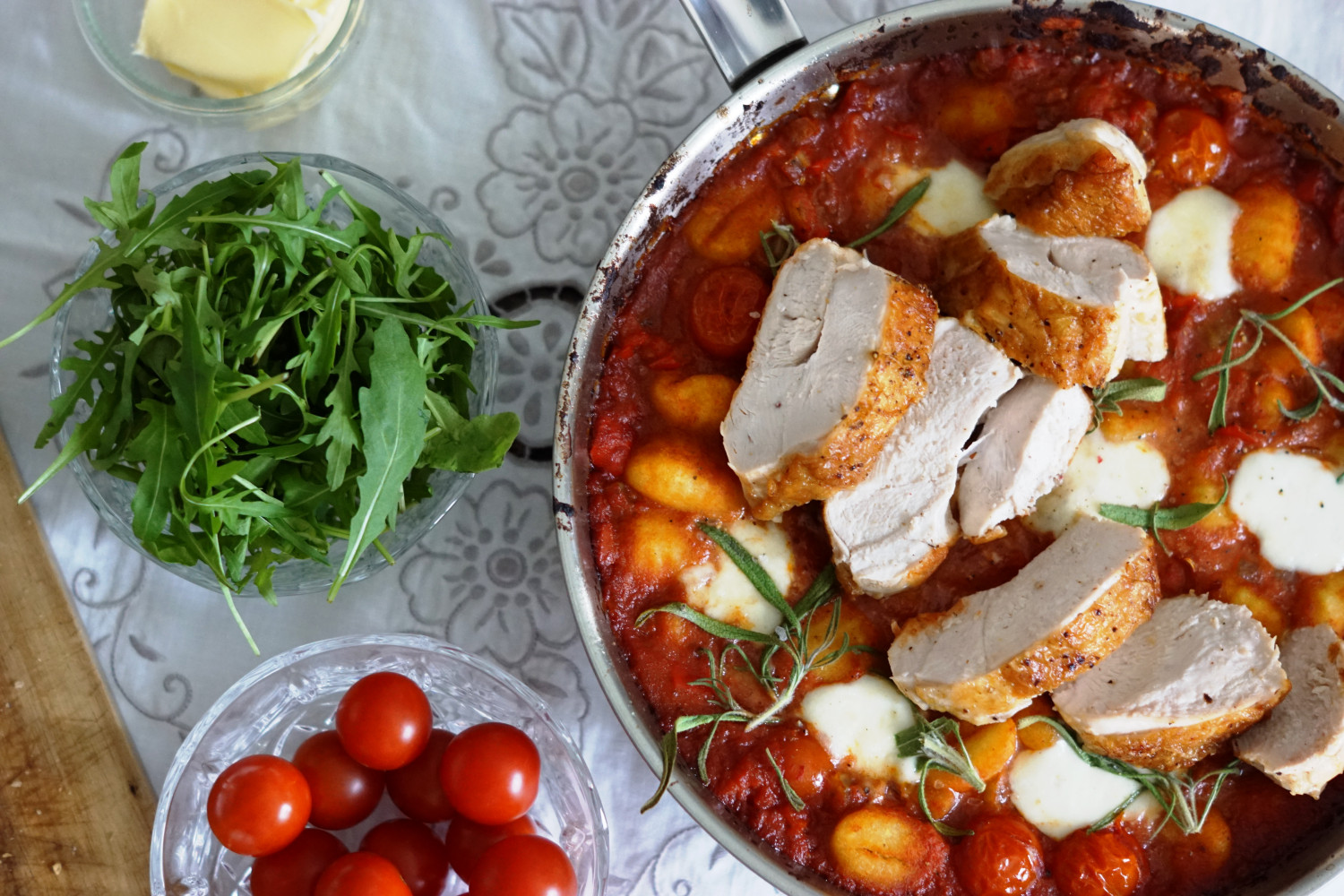 Her får du opskriften på en “alt i en pande” opskrift – en såkaldt “one pan recipe”. Alle ingredienserne tilberedes nemt og hurtigt på panden og tilslut kommer retten i ovnen, hvor den passer sig selv til gnoochien er veltilberedt (ca. 15-20 minutter).