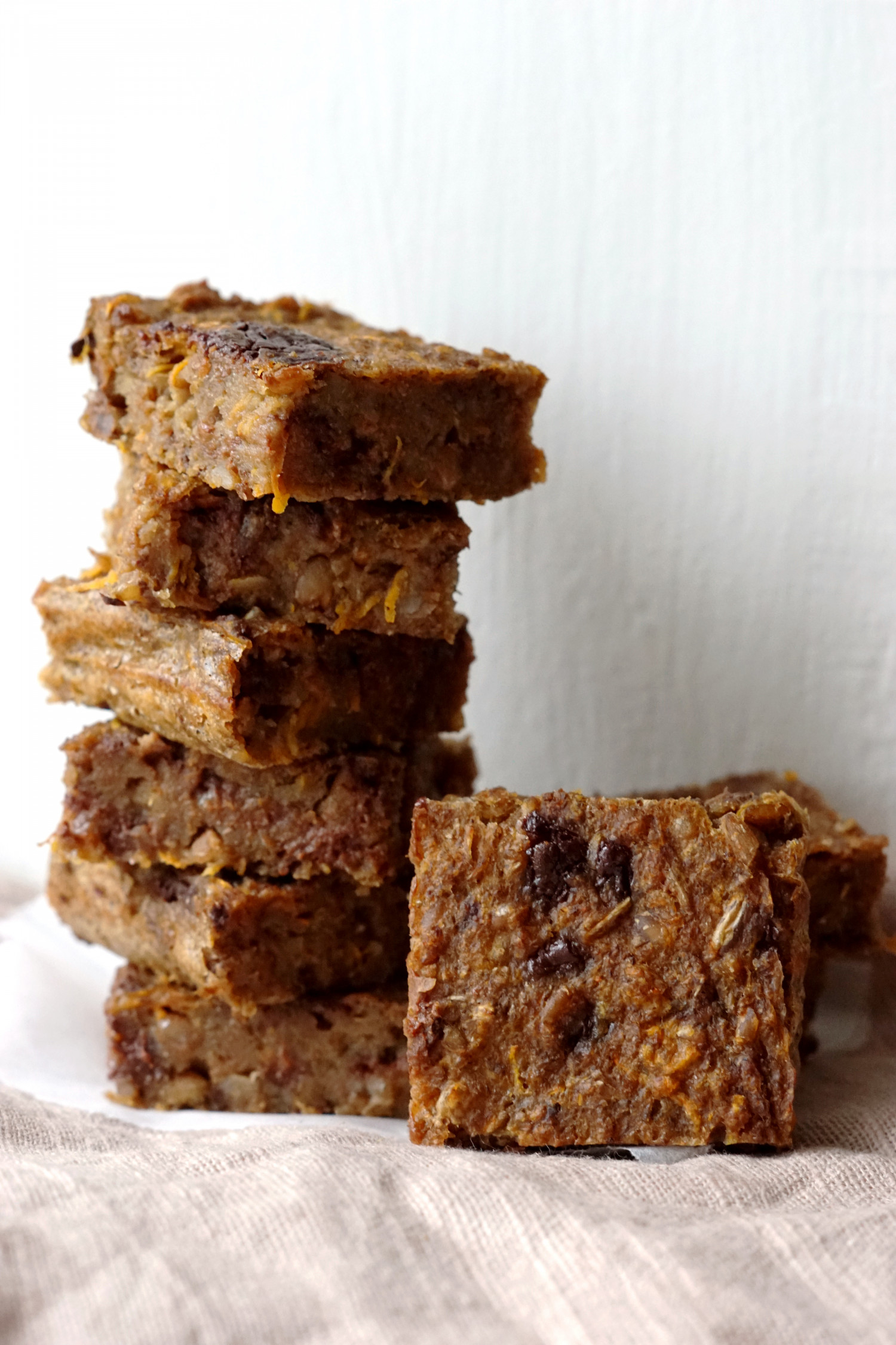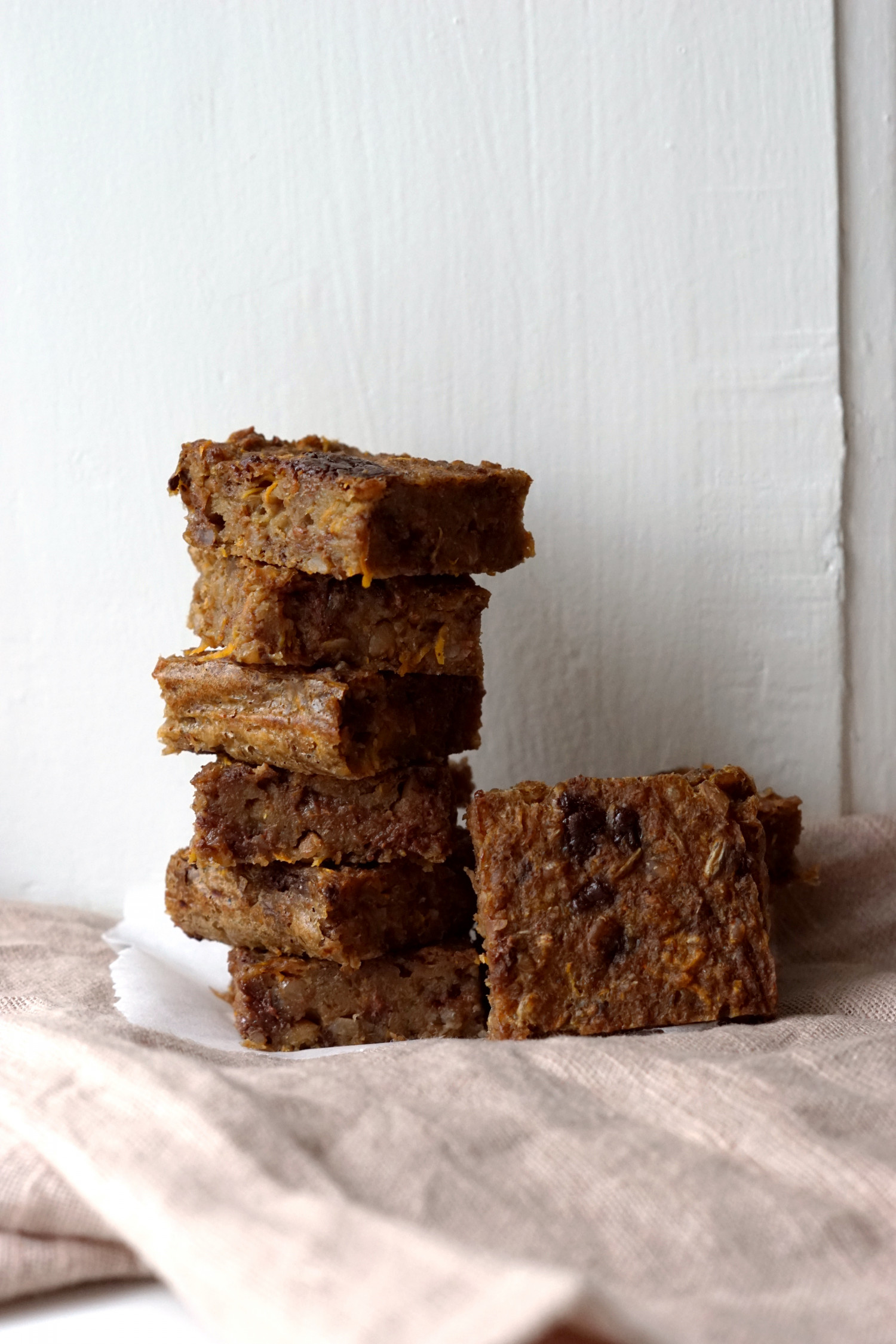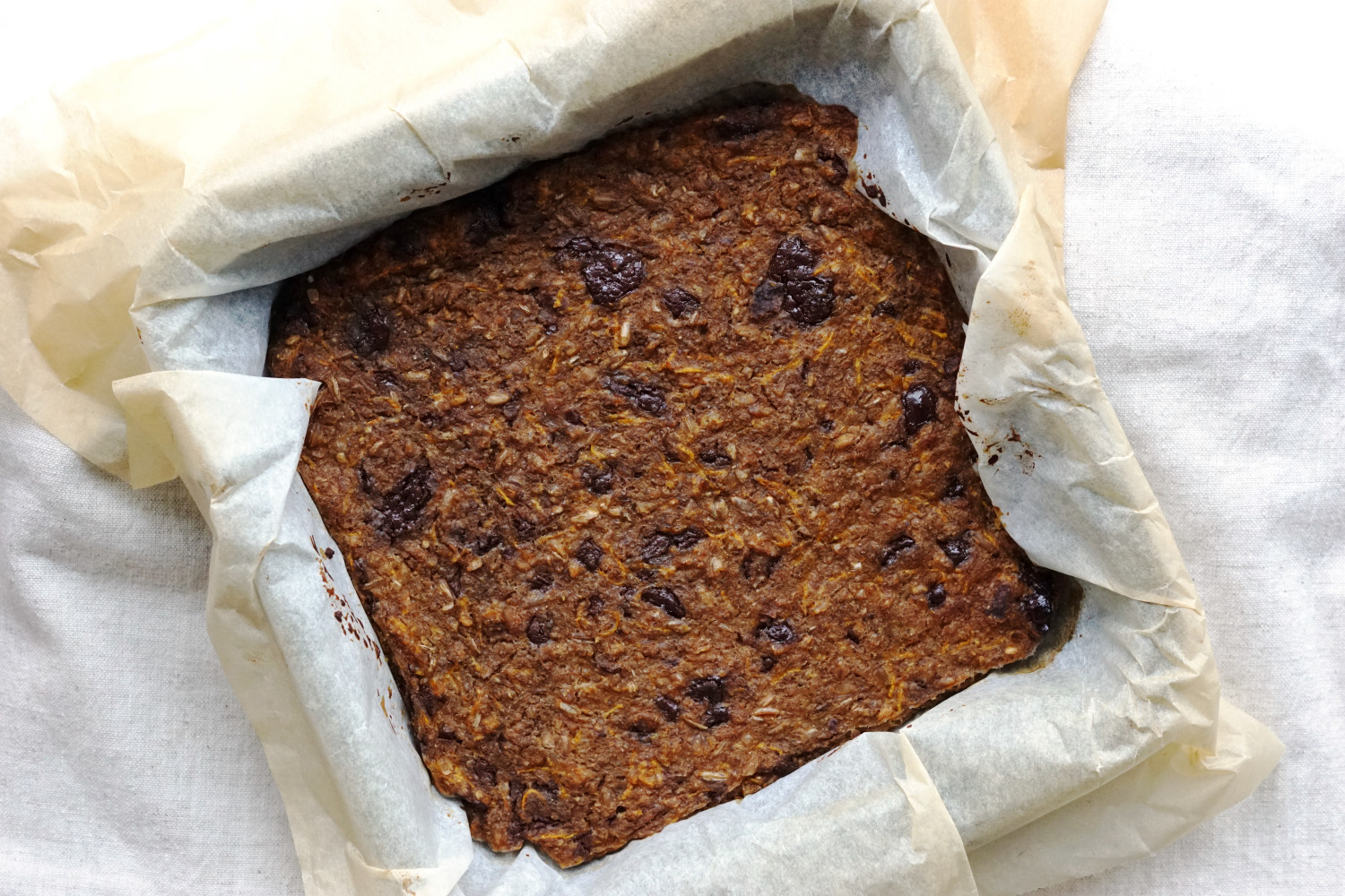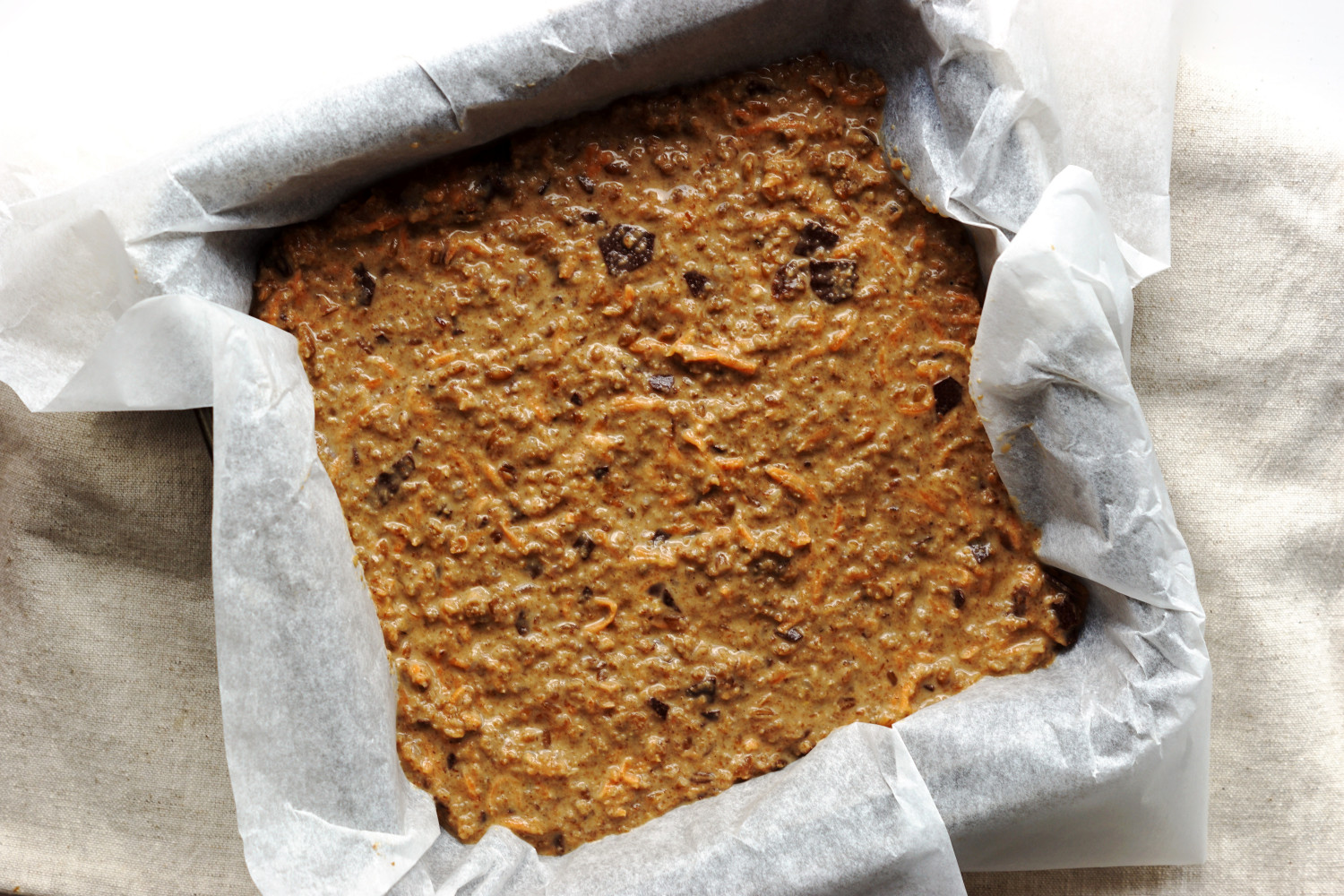 Tilsæt herefter hvedemelet, den mørke chokolade og den revne gulerod. Rør det hele godt sammen og fordel i en bageform (ca. 20 x 20 cm) beklædt med bagepapir og bag i en forvarmet ovn ved 190 grader varmluft i 13-18 minutter. Mærk at massen er fast og har en let skorpe. Så er det færdigt.