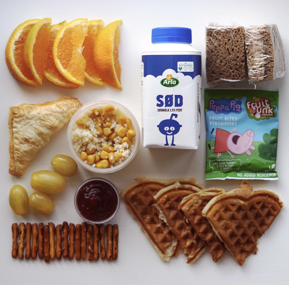 Appelsinbåde, sødmælk, rugbrød-klapsammen med leverpostej, butterdejssamosa m. grønt og oksekød, bulgur/majs-salat, Gurli Gris tørret frugtsnack, gule cherrytomater, mini saltstænger, jordbærmarmelade og vafler.