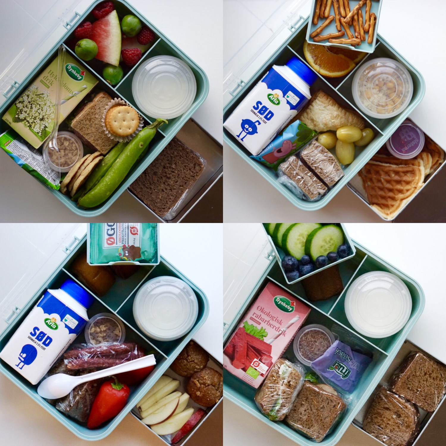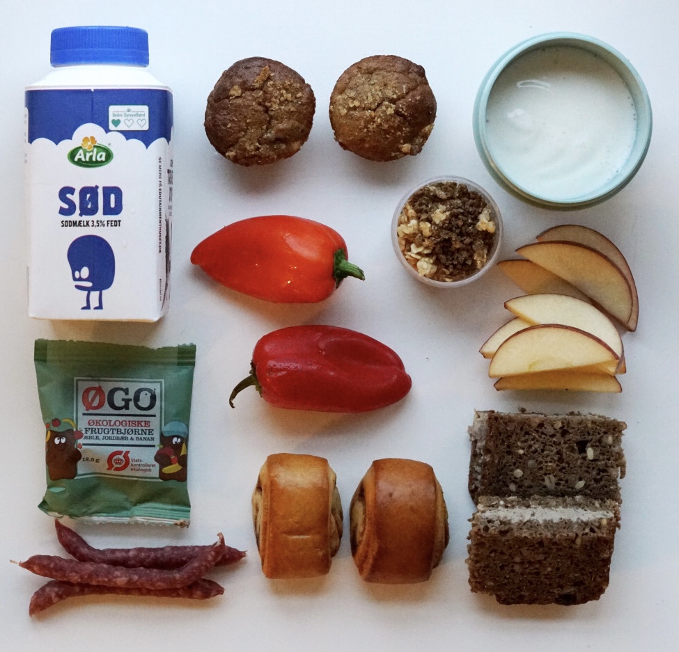 Sødmælk, fibermuffins, tykmælk, blandet müsli, røde snackpeber, æblebåde, tørrede frugtbamser, snack salamier, kanelgifler og rugbrød-klapsammen m. leverpostej.