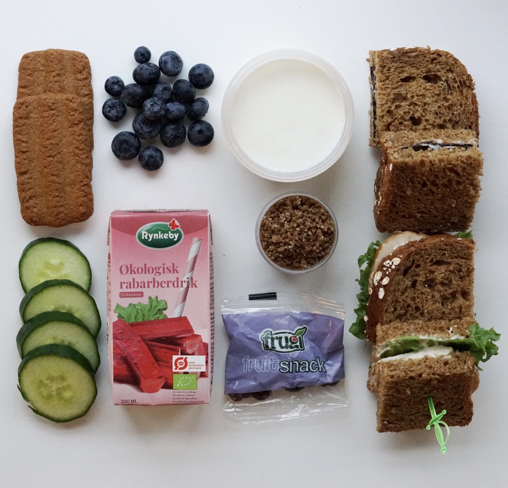 Krydderkiks, blåbær, tykmælk, fuldkornstoast m. smør og mørk pålægschokolade, fuldkornstoast m. mayo/salat/kyllingepålæg/agurk, tykmælk, rugbrødsdrys, tørret frugtsnack m. blåbær, rabarberdrik og agurk.