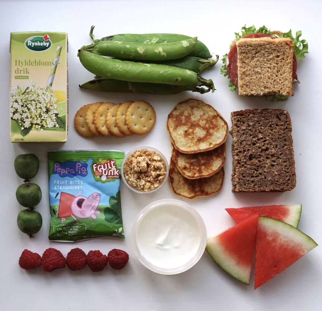 Hyldeblomstdrik, ærter i bælg, fuldkornstoast m. mayo/salat/oksespegepølse, små runde saltkiks, små banan-boghvede pandekager, rugbrød-klapsammen m. peanutbutter, kiwibær, hindbær, tykmælk, ristet müsli, Gurli Gris tørret frugtsnack og vandmelon.