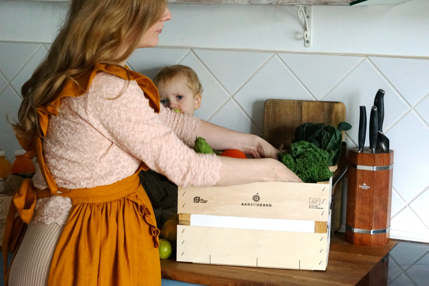 Jeg pakker varer ud – og Adam får et æble frisk fra frugtkurven. Han elsker at smage på tingene, og tager gerne lige en bid af grønkål, figner og andet. Men æblet vandt altså i dag. Når jeg modtager varer lader jeg gerne børnene se, mærke og smage de frugter og grøntsager de er nysgerrige på. Fordi alt fra Aarstiderne er økologisk er jeg helt tryg ved at servere det for mine børn – varerne er nemlig ikke sprøjtede med syntetiske pesticider.