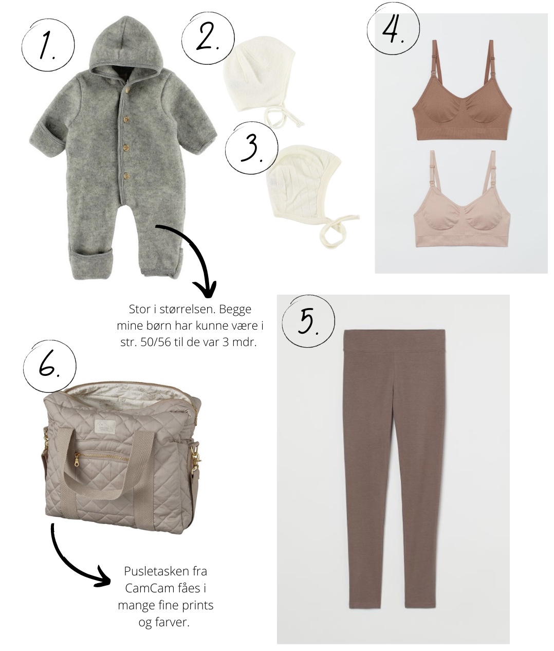 1. Engel, Køredragt i uld // 2. Joha, Babyhjelm i uld // 3. Joha, Babyhjelm i uld/silke // 4. H&M, Amme BH’er (2-pak) // 5. H&M, Leggings i bomuld // 6. CamCam, pusletaske (farve: hazel)
