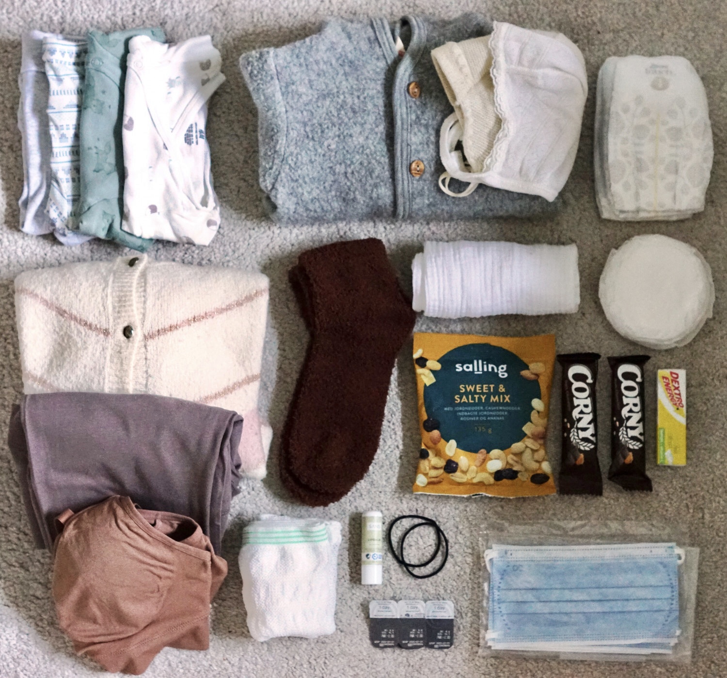Lidt snacks til far/partner (eller hvis mor alligevel er småsulten) er også rart at have med. Jeg har müslibarer og en nøddeblanding med.