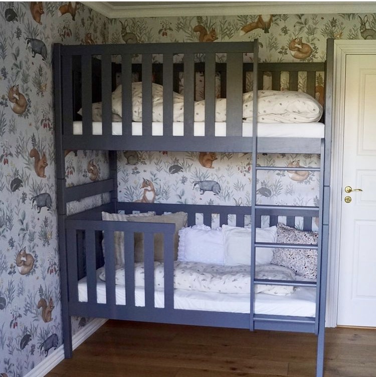 Køjesengen er fra firmaet Littlehugs og er modellen David Køjeseng. Jeg har valgt, at sengen skulle være 80 x 160 cm (her er der mange muligheder for at vælge mål – tjek hjemmesiden), farven på vores hedder “grafit”, barrieren nederst er fastsiddende (den kan man vælge skal være aftagelig) og så er der ekstra frihøjde på sengen (så der er 22 cm ekstra afstand mellem nederste og øverste madras).