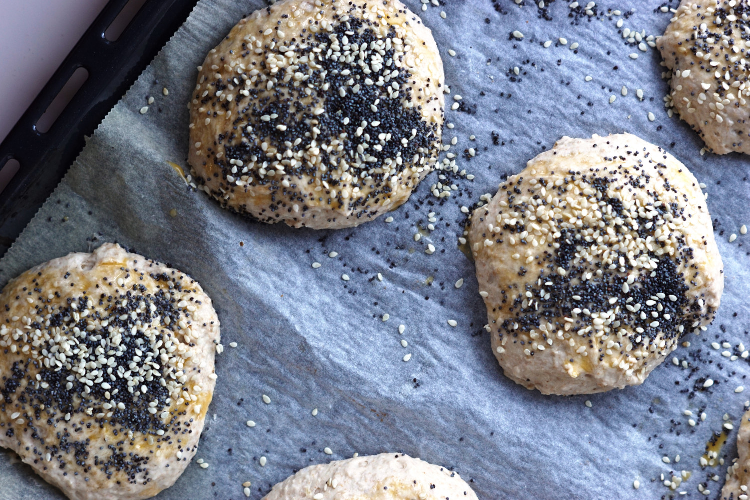 Pensl alle morgenstykkerne med sammenpisket æg og drys hvert af dem med rigeligt birkes og sesam på toppen.