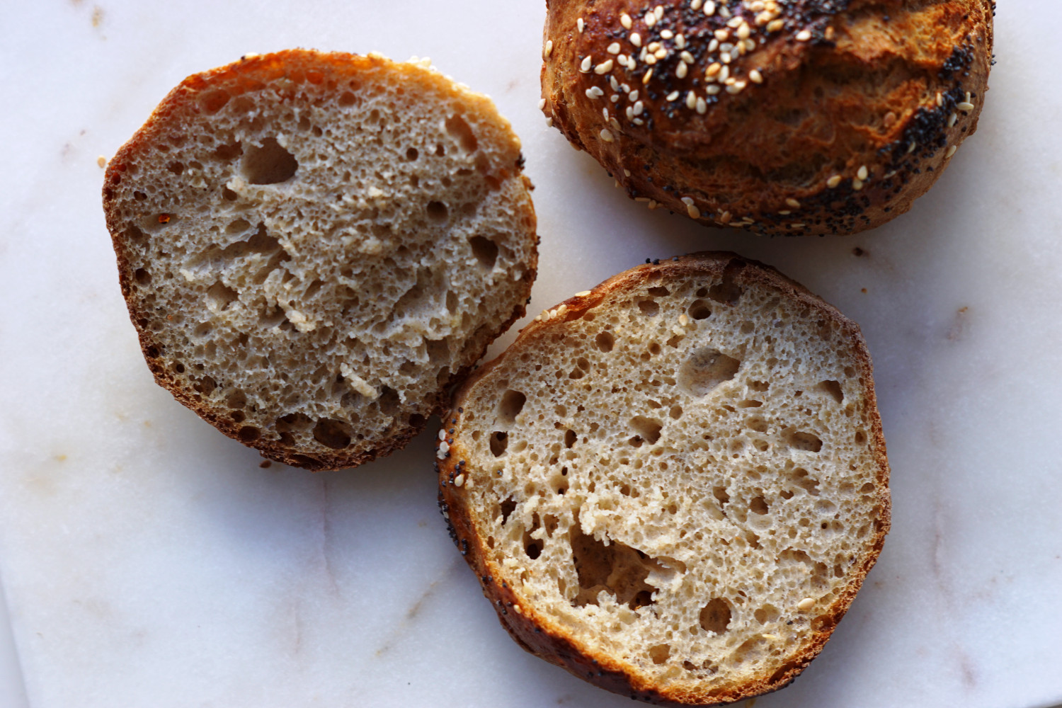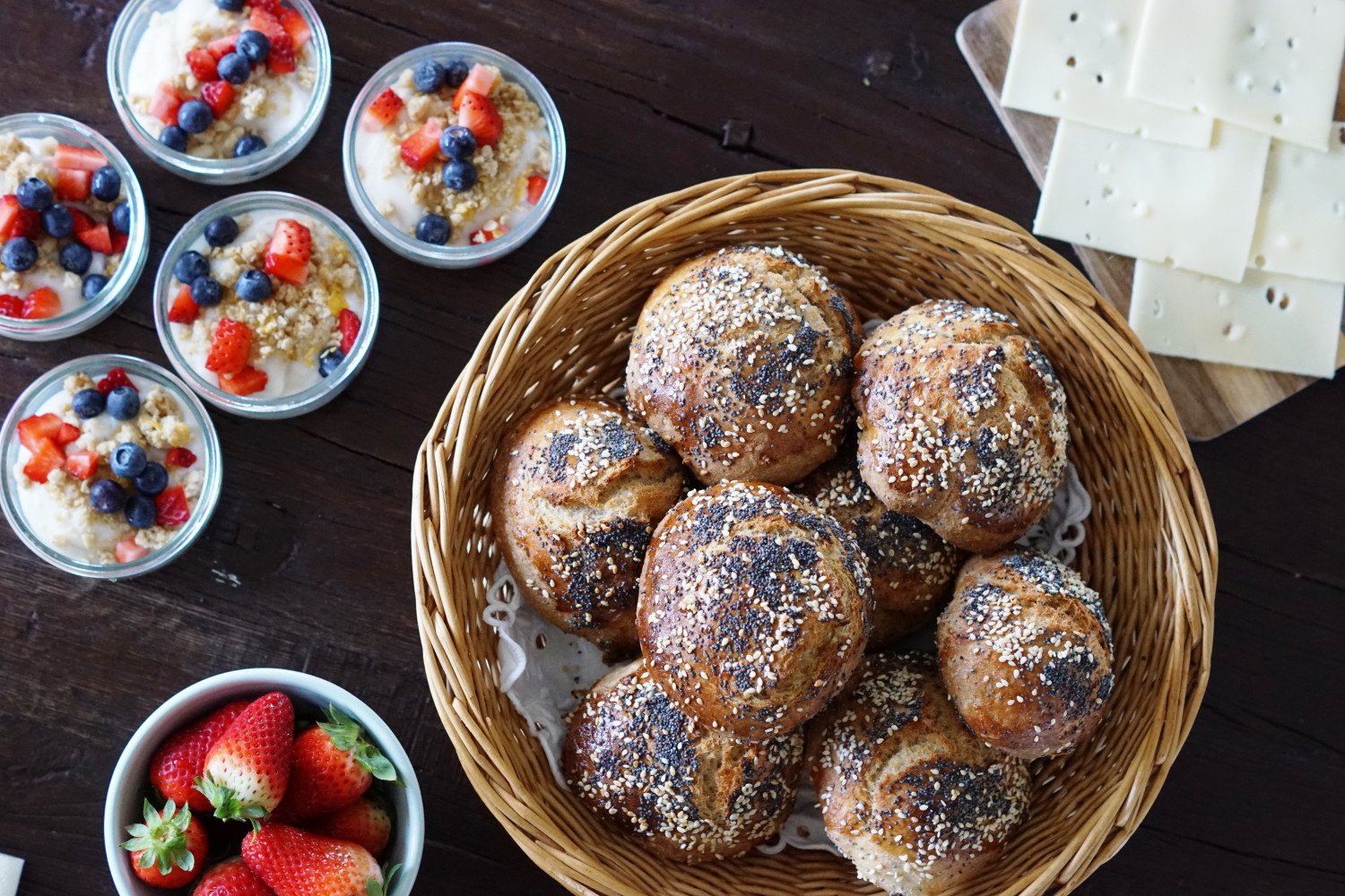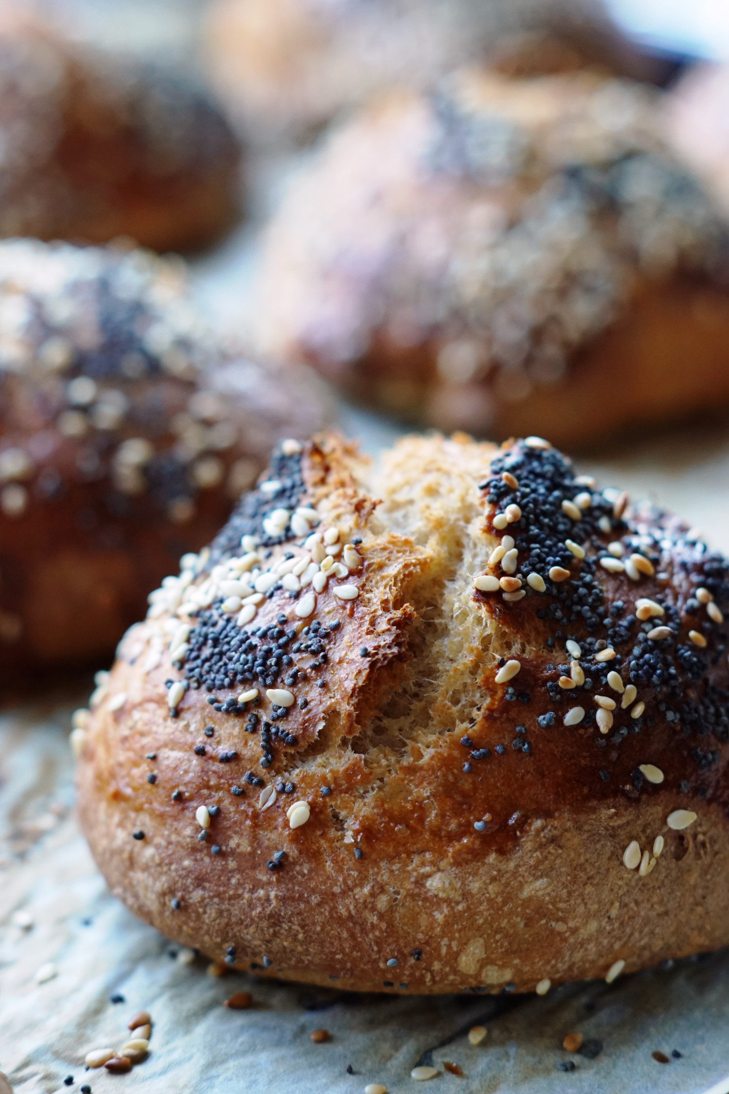 Morgenstykkerne her er nemme at bage og man slipper for dej på køkkenbordet, da de blot skal røres sammen i hånden og hæve i køleskabet natten over. Om morgenen fanger man så bare dejen med et par spiseskeer, pensler med æg og drysser med birkes og sesam i gavmilde mængder.