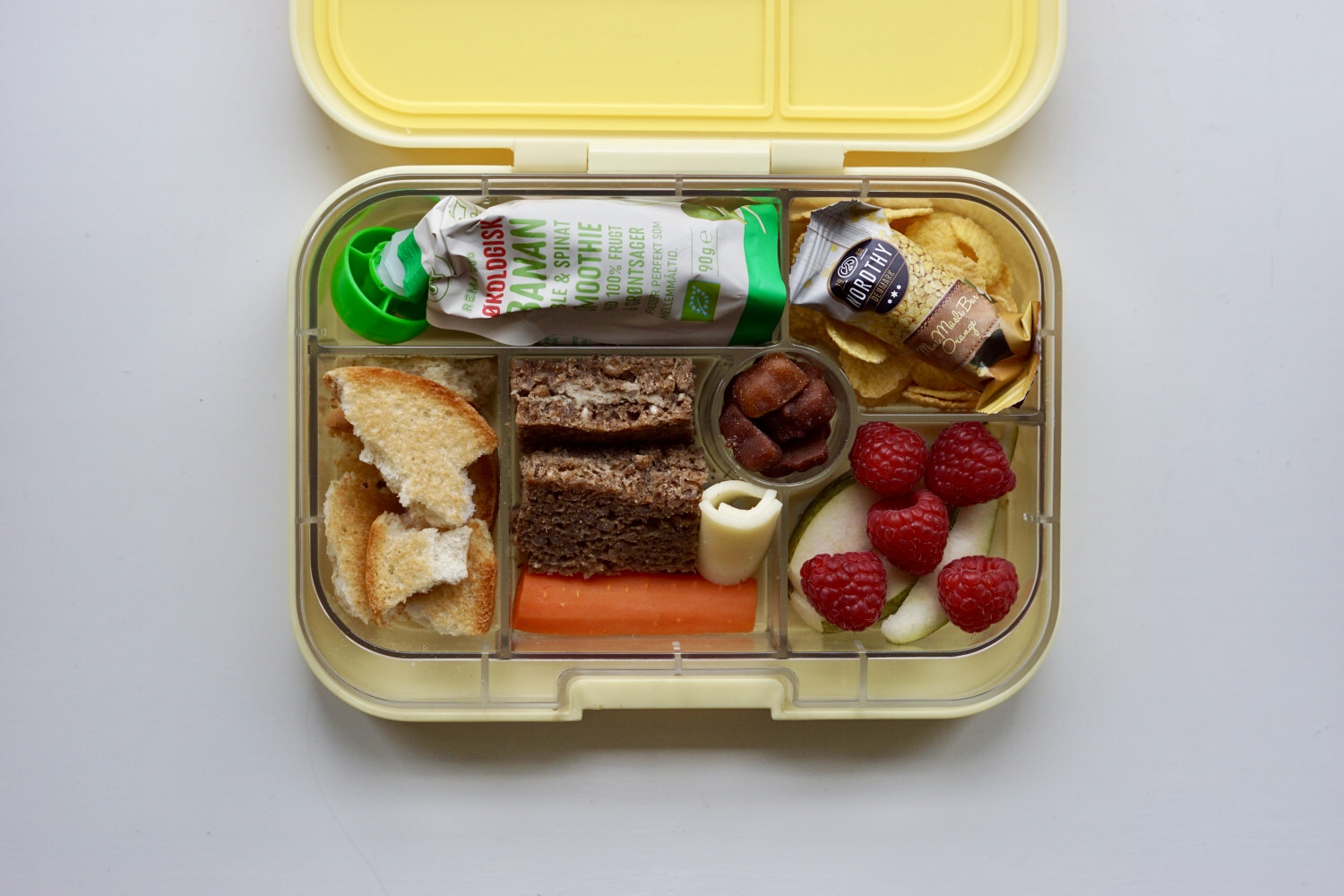 MADPAKKE 4: Smoothie m. banan og spinat (forhandles hos Rema1000), cornflakes, müslibar, knust krydder, rugbrødsklapssammen m. leverpostej, kogt gulerod, ost, pære, hindbær og frugtbamser (forhandles hos netto og Rema1000).