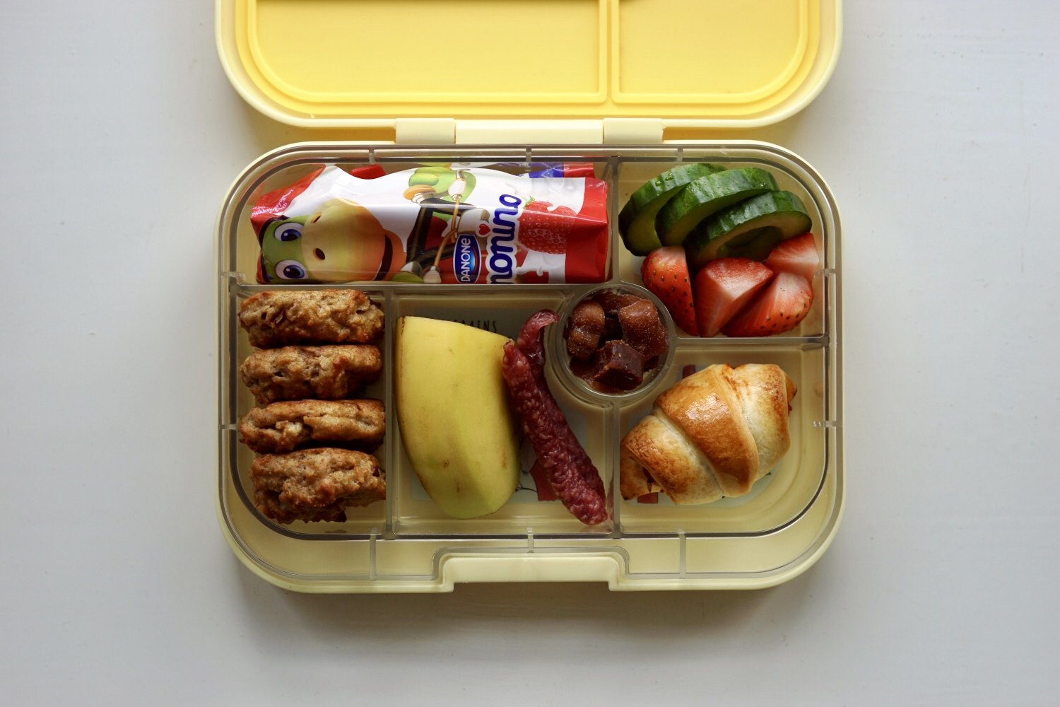 MADPAKKE 2: Jordbær yoghurt (danonino), agurk, jordbær, krydrede mini grødboller (klik her for opskrift), banan, snack salami, mix af figenstang i tern/frugtbamser (frugtbamser forhandles i netto og Rema1000) og pølsehorn.