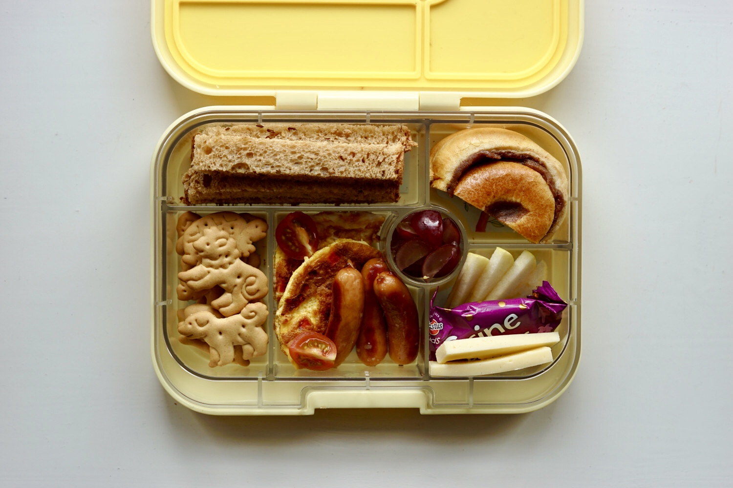 MADPAKKE 3: Toastskiver, zoo kiks (forhandles hos Føtex og Rema1000) , 1/2 kanelbolle, omelet m. peberfrugt, ristede pølser, cherrytomat, vindruer, æblebåde, ostestave og figensnack.