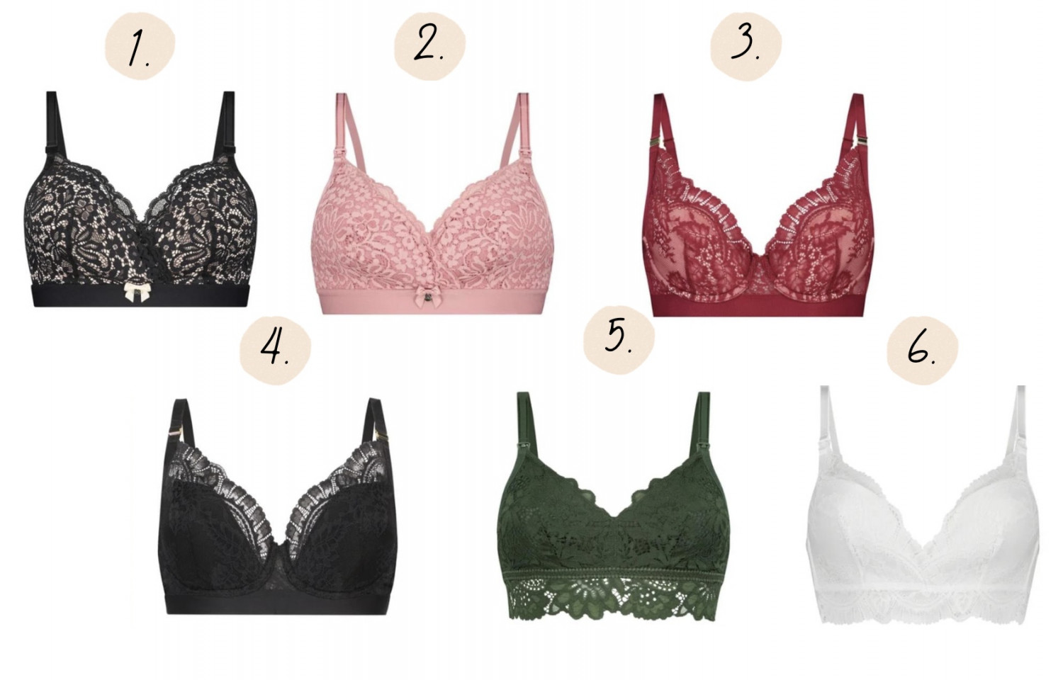 1. Formstøbt amme-bh, Rose, sort // 2. Formstøbt amme-bh, Rose, lilla // 3. Formstøbt amme-bh, Adelaide, rød // 4. Formstøbt amme-bh, Adelaide, sort // 5. Formstøbt amme-bh uden bøjle, Shiloh, grøn // 6. Formstøbt amme-bh uden bøjle, Gracie, hvid