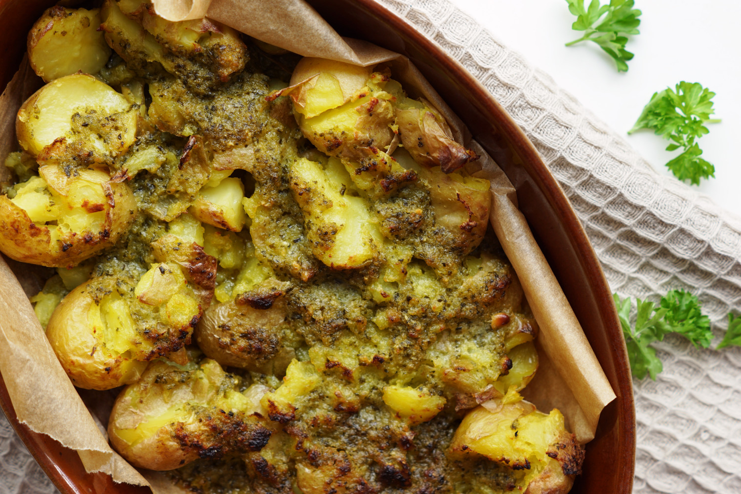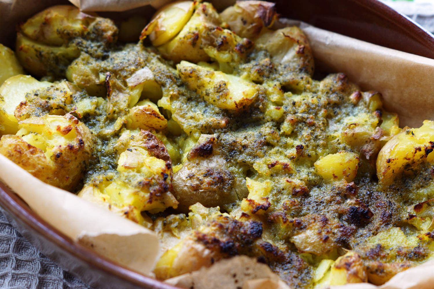 De knuste pesto-hvidløgskartofler er fulde af smag, nemme at lave og er skønt tilbehør til nærmest alle middagsretter.